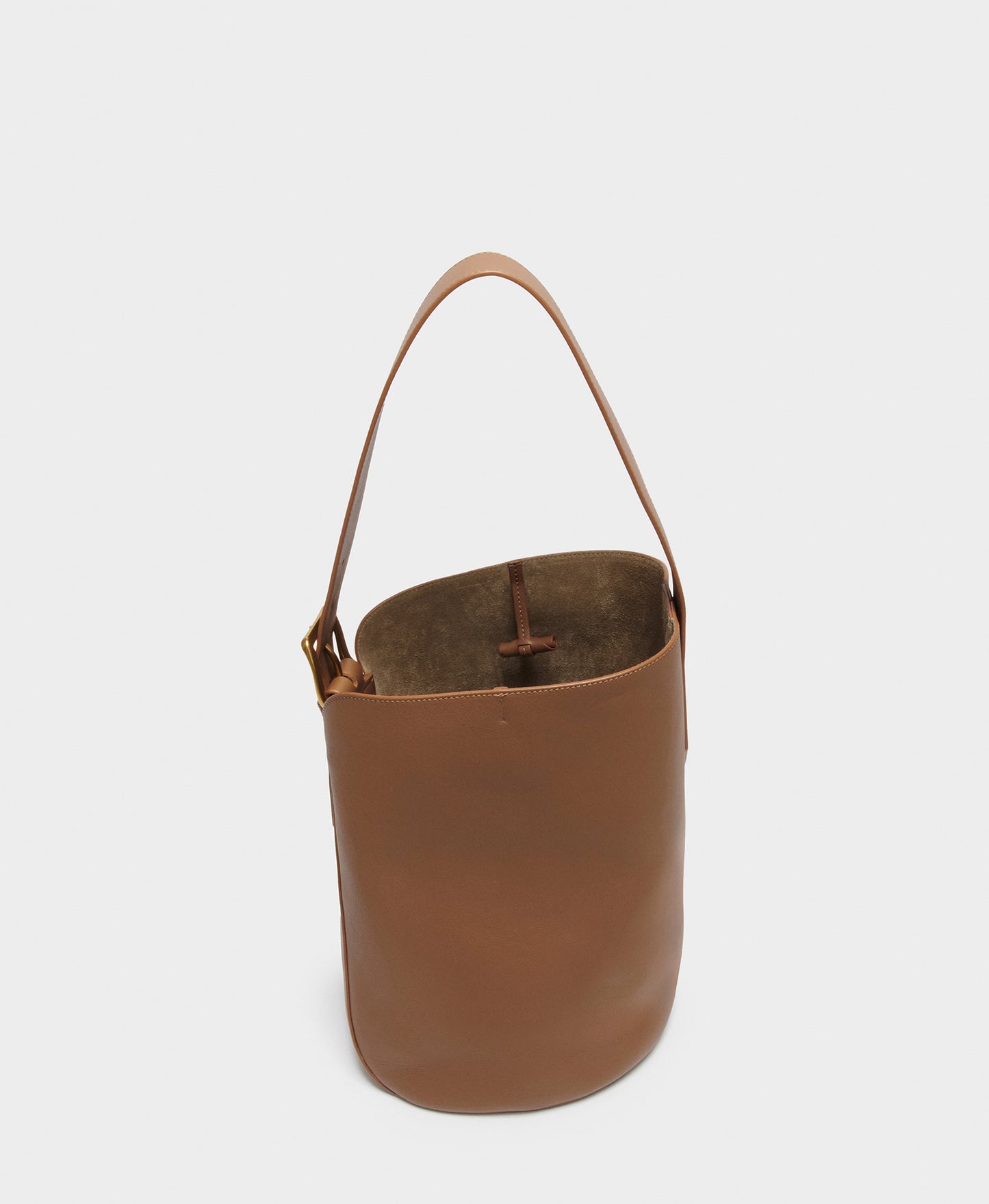 A uniquely shaped bag inspired by archers' quivers. With statement embossed hardware, the bag is made from caramel, smooth calf leather, and lined with suede. The bag is large enough to fit a laptop, and the adjustable handle allows the bag to be carried over the shoulder or in hand.