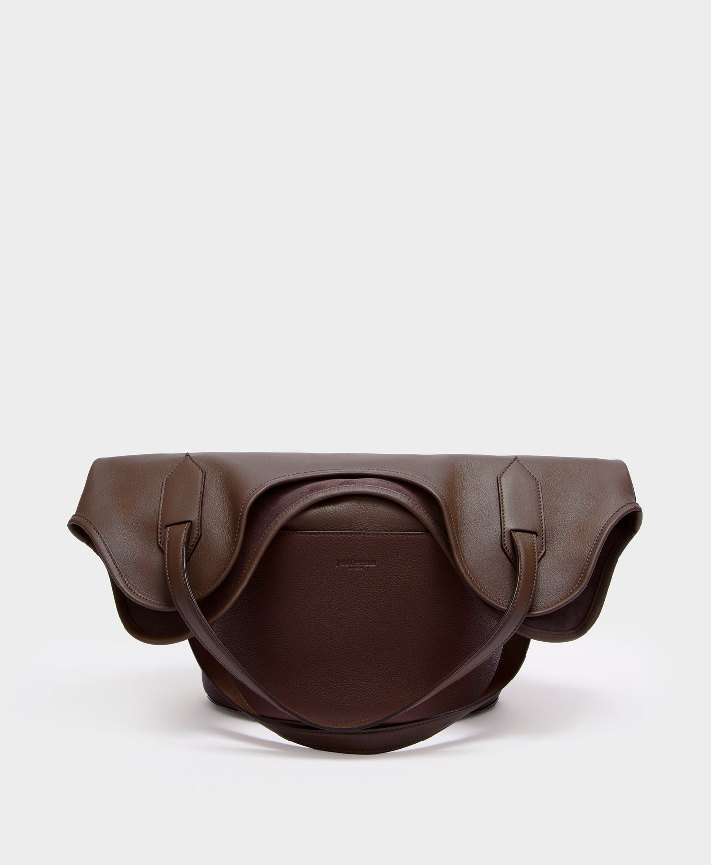 Taking its name from the stingray, whose shape it mimics, the Ray Bucket bag in cacoa is a bucket bag made from two types of leather; the bottom is made from small grain and lined with suede, which is both durable and provides texture, and the upper area is made from unlined smooth calf with a suede finish, allowing the bag to be folded and carried under the arm, clutch style.