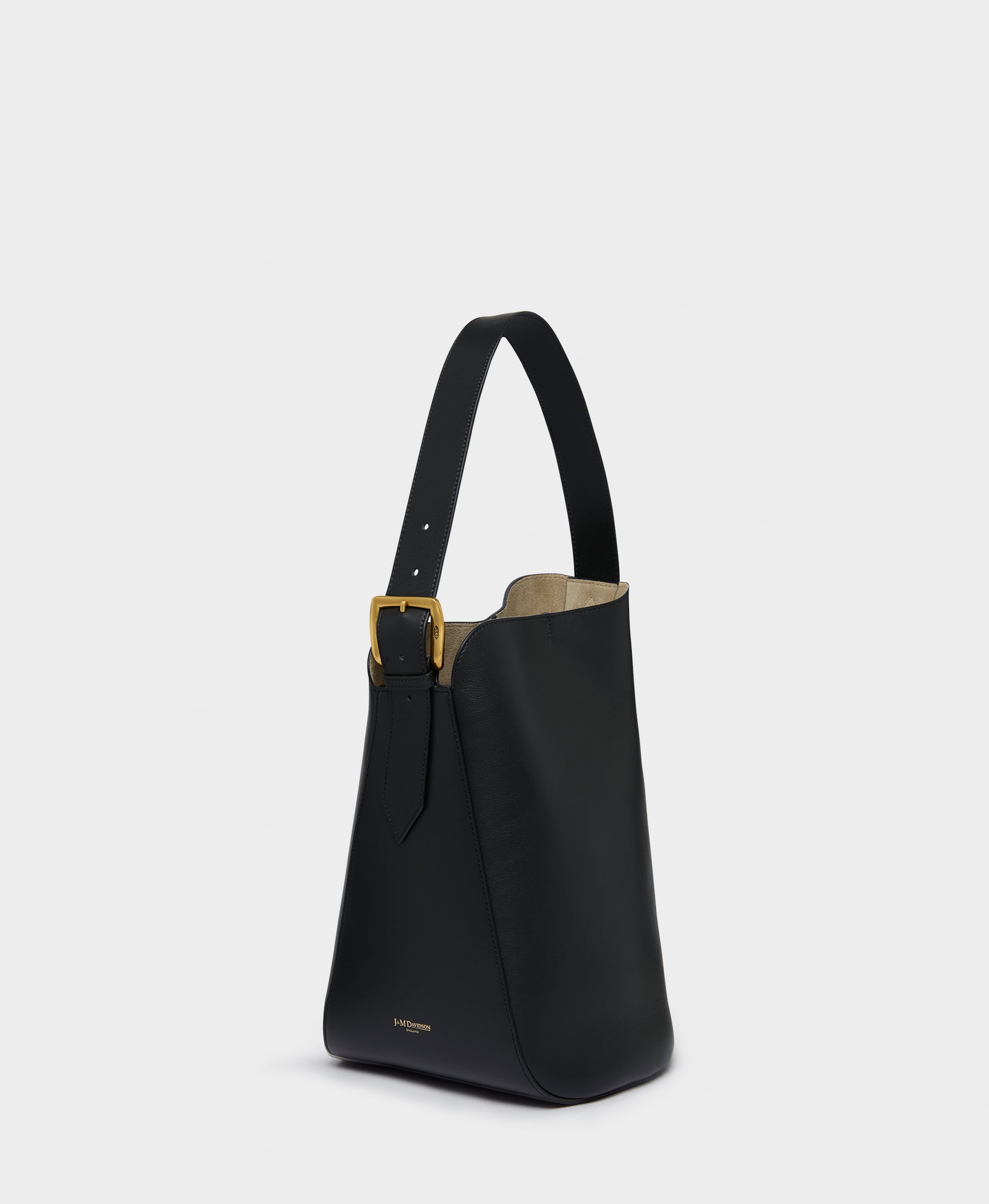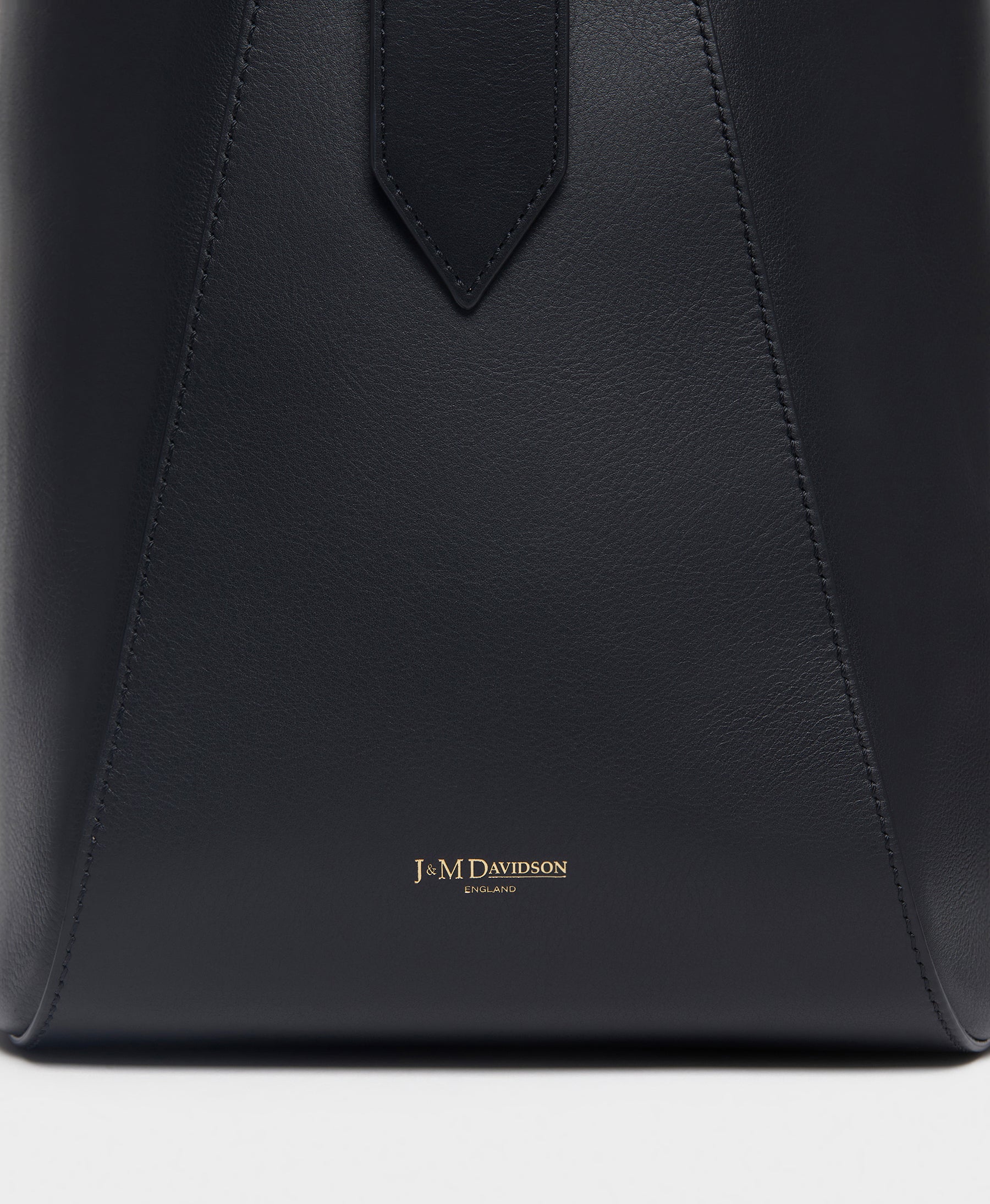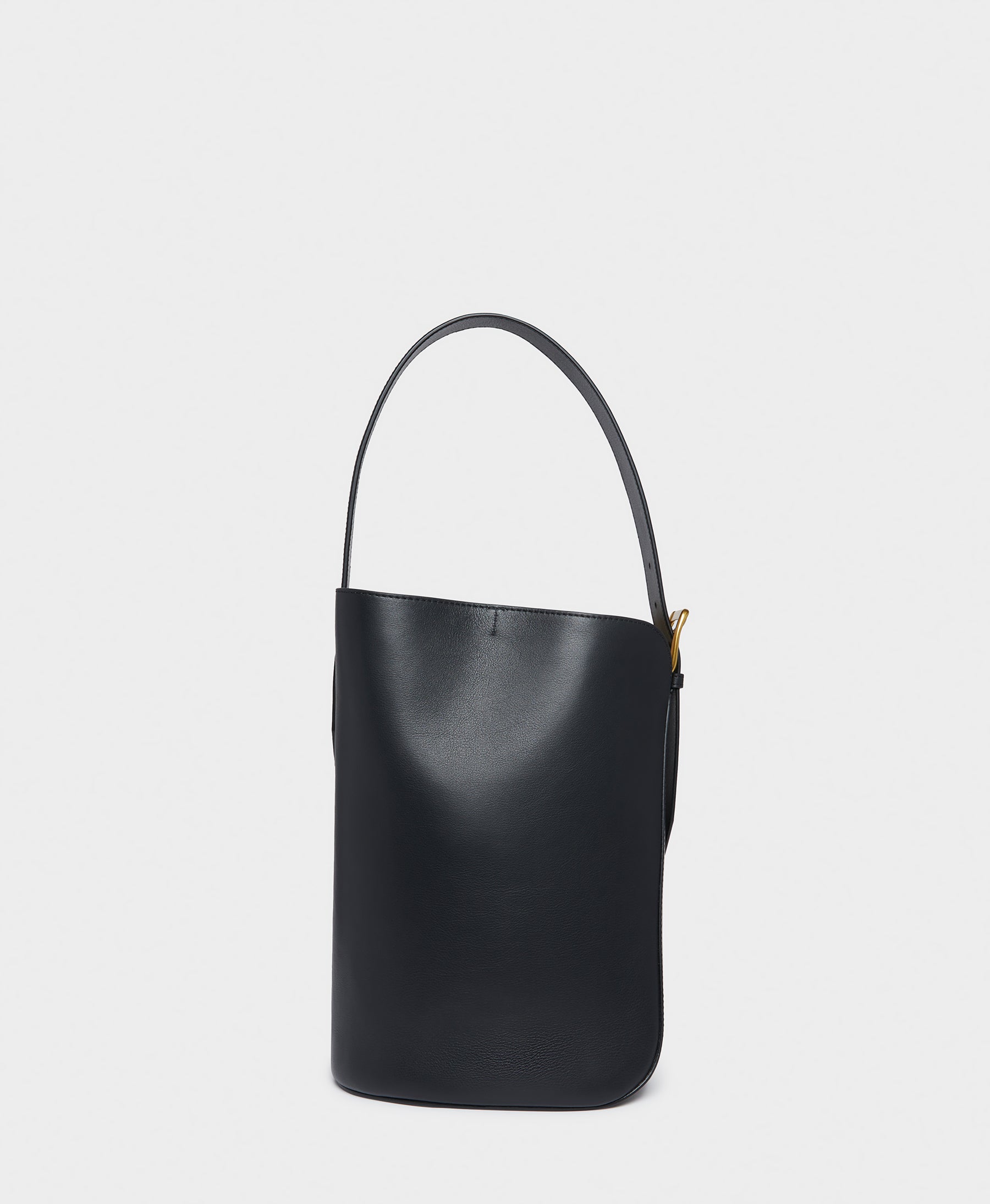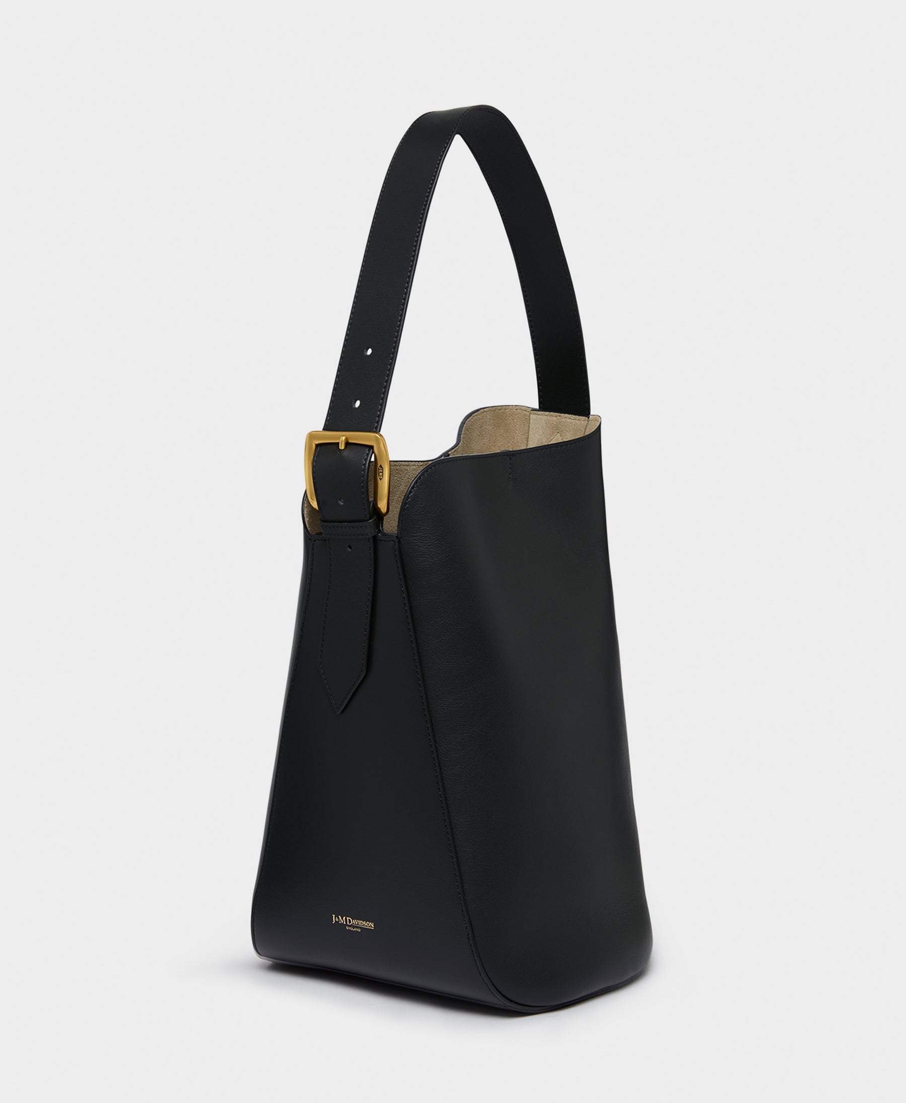A uniquely shaped bag inspired by archers' quivers. With statement embossed hardware, the bag is made from black, smooth calf leather, and lined with suede. The bag is large enough to fit a laptop, and the adjustable handle allows the bag to be carried over the shoulder or in hand.