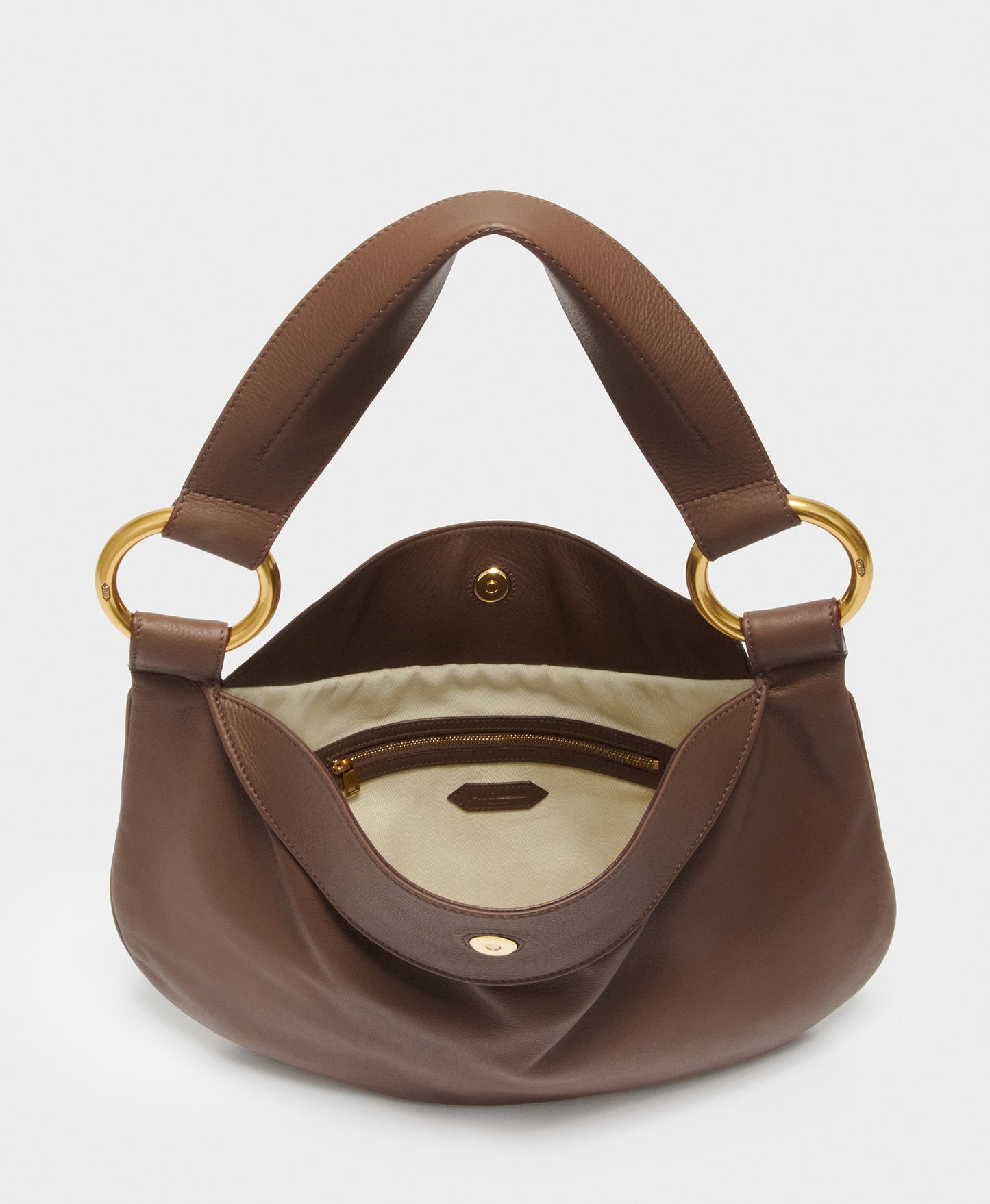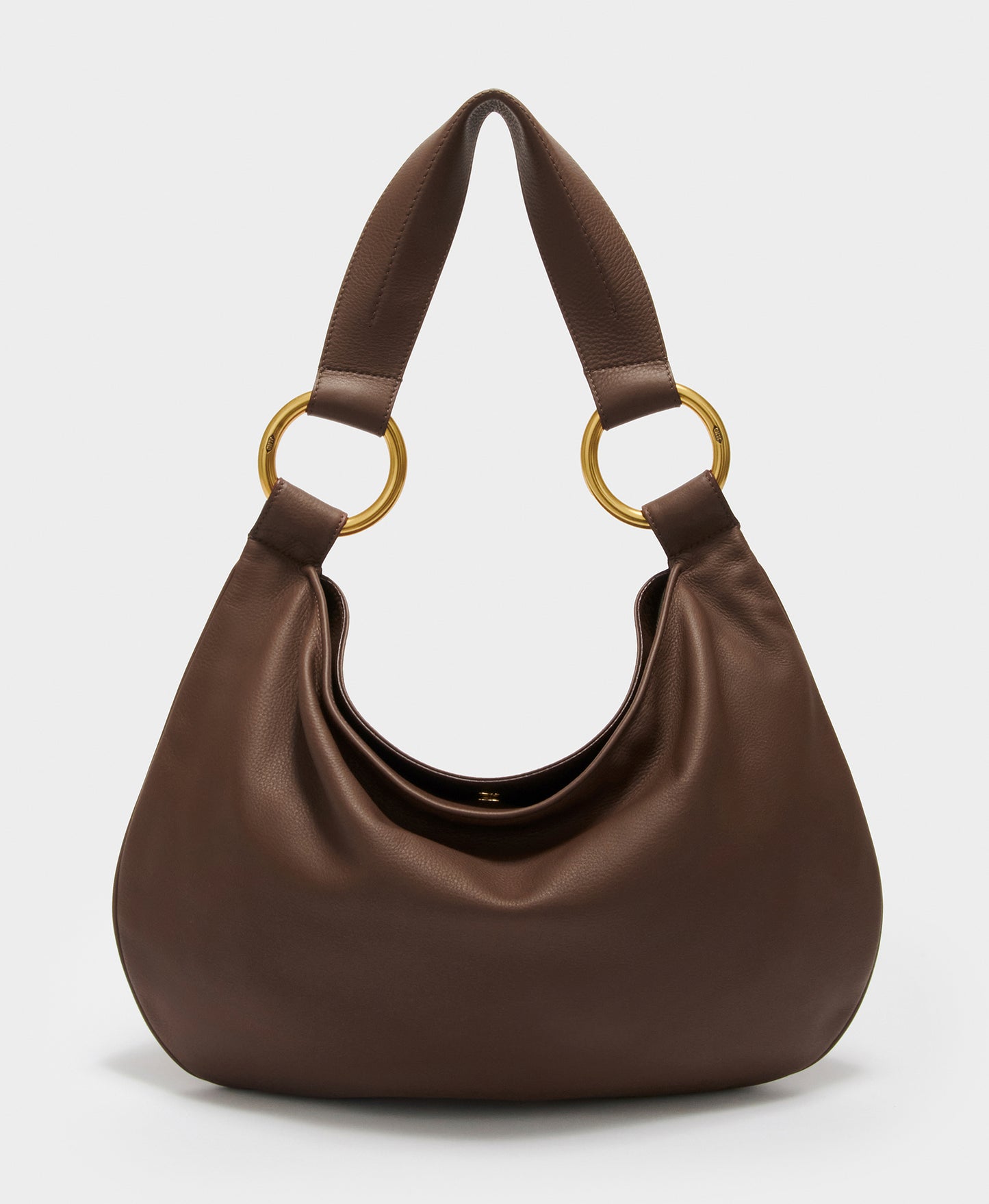 The Hoop in cacao is a new addition to our offering that draws its inspiration from vintage ring hardware found in J&M Davidson's archive collection. Its design mimics the circular form of these rings, seamlessly blending curves with supple natural grain leather. It is a wonderfully relaxed hobo-style bag that effortlessly accommodates your daily essentials. With a uniquely curved handle that rests snugly on your shoulders, it also conveniently folds in half for comfortable hand-carrying when needed.