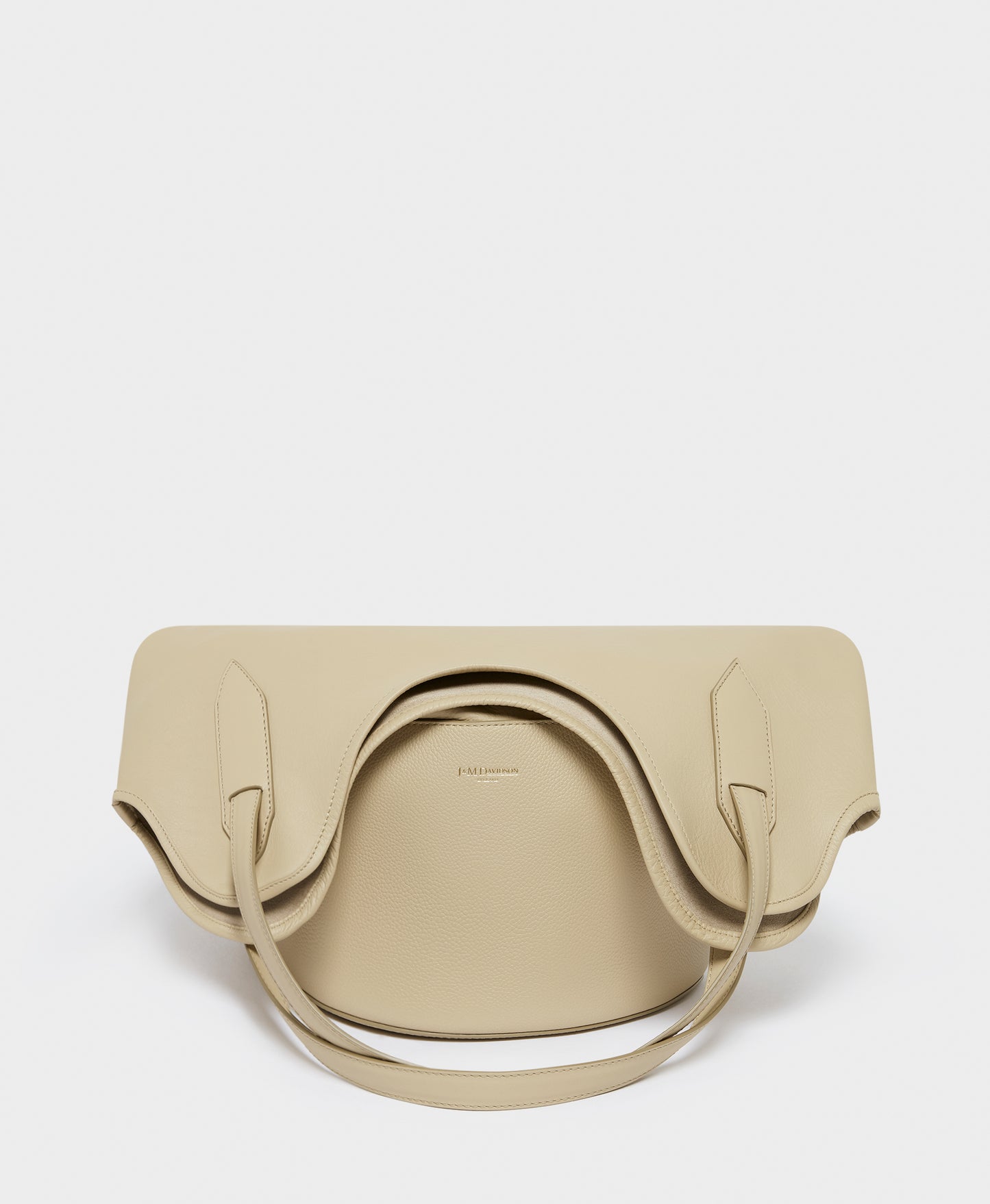 Taking its name from the stingray, whose shape it mimics, the Ray Bucket bag in cappuccino is a bucket bag made from two types of leather; the bottom is made from small grain and lined with suede, which is both durable and provides texture, and the upper area is made from unlined smooth calf with a suede finish, allowing the bag to be folded and carried under the arm, clutch style.