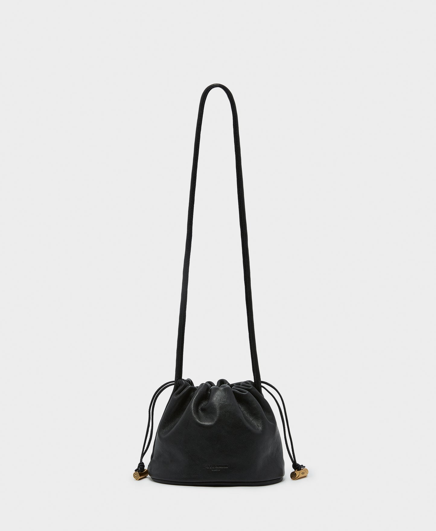 The Escargot is a new mini drawstring pouch bag with a design inspired by the shape of a snail. Crafted from black textured nappa leather with a soft, buttery feel, it features branded gold hardware that adds an elevated finish. Spacious enough to fit a phone and other small essentials, this versatile bag is suitable for any occasion.