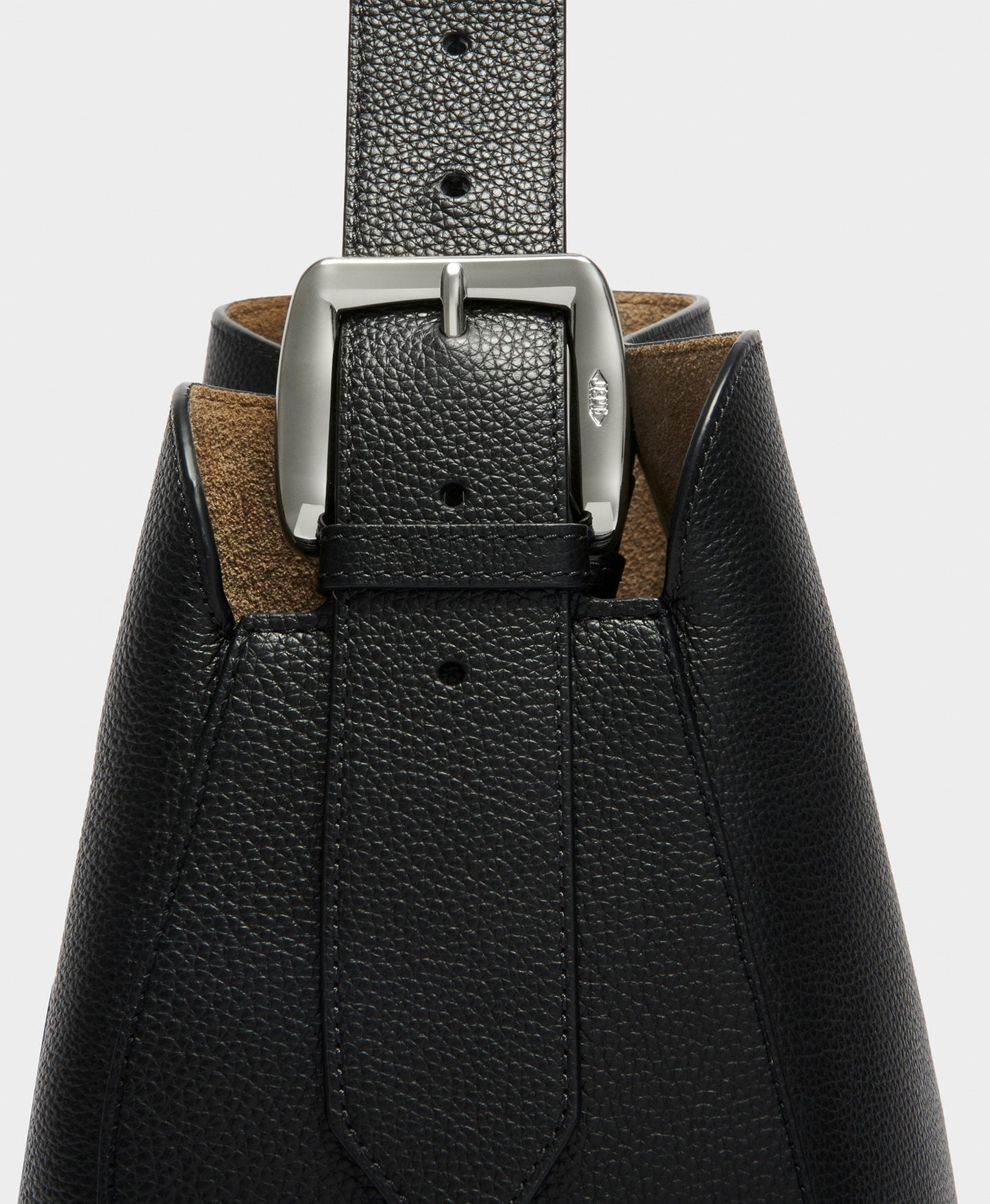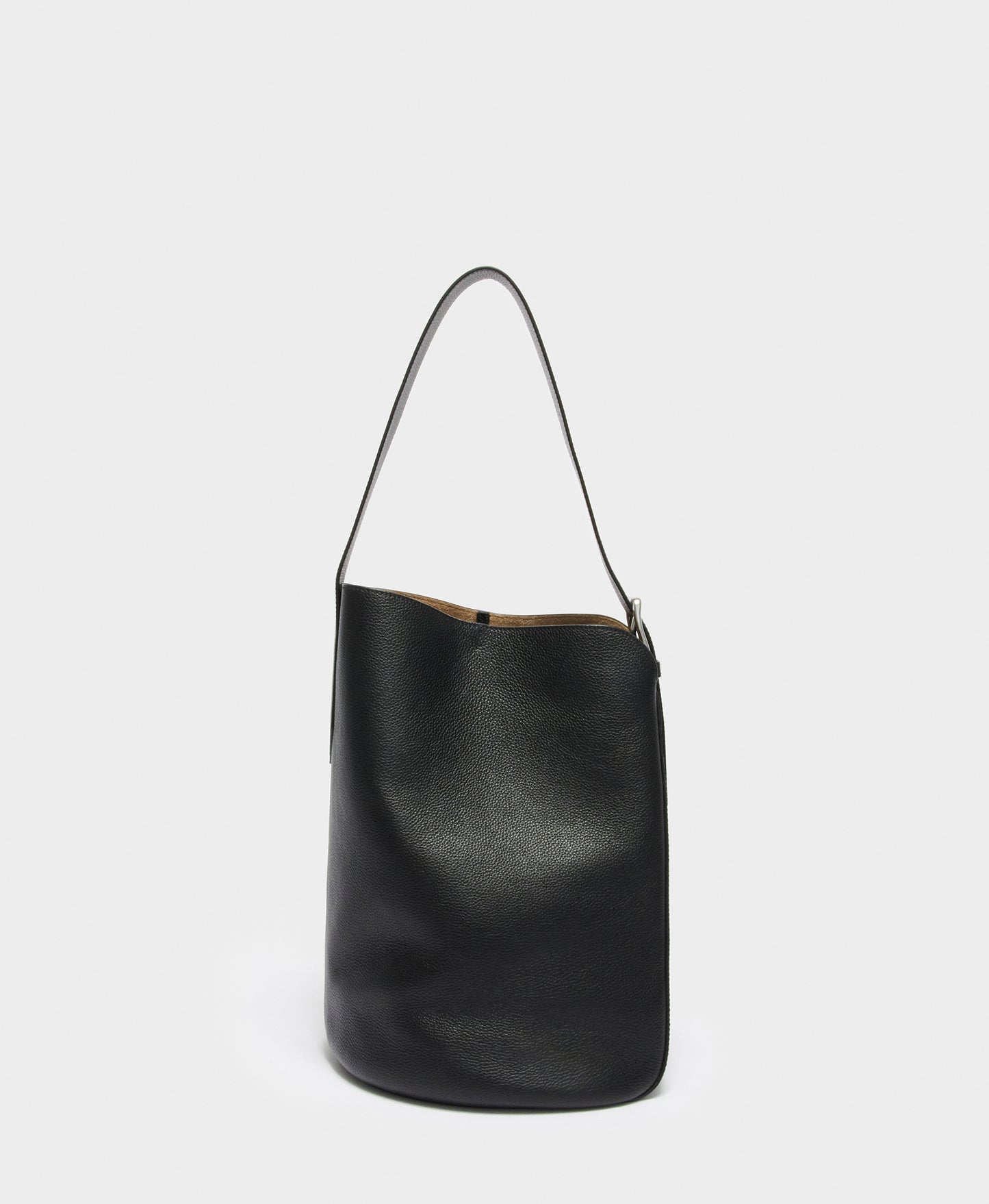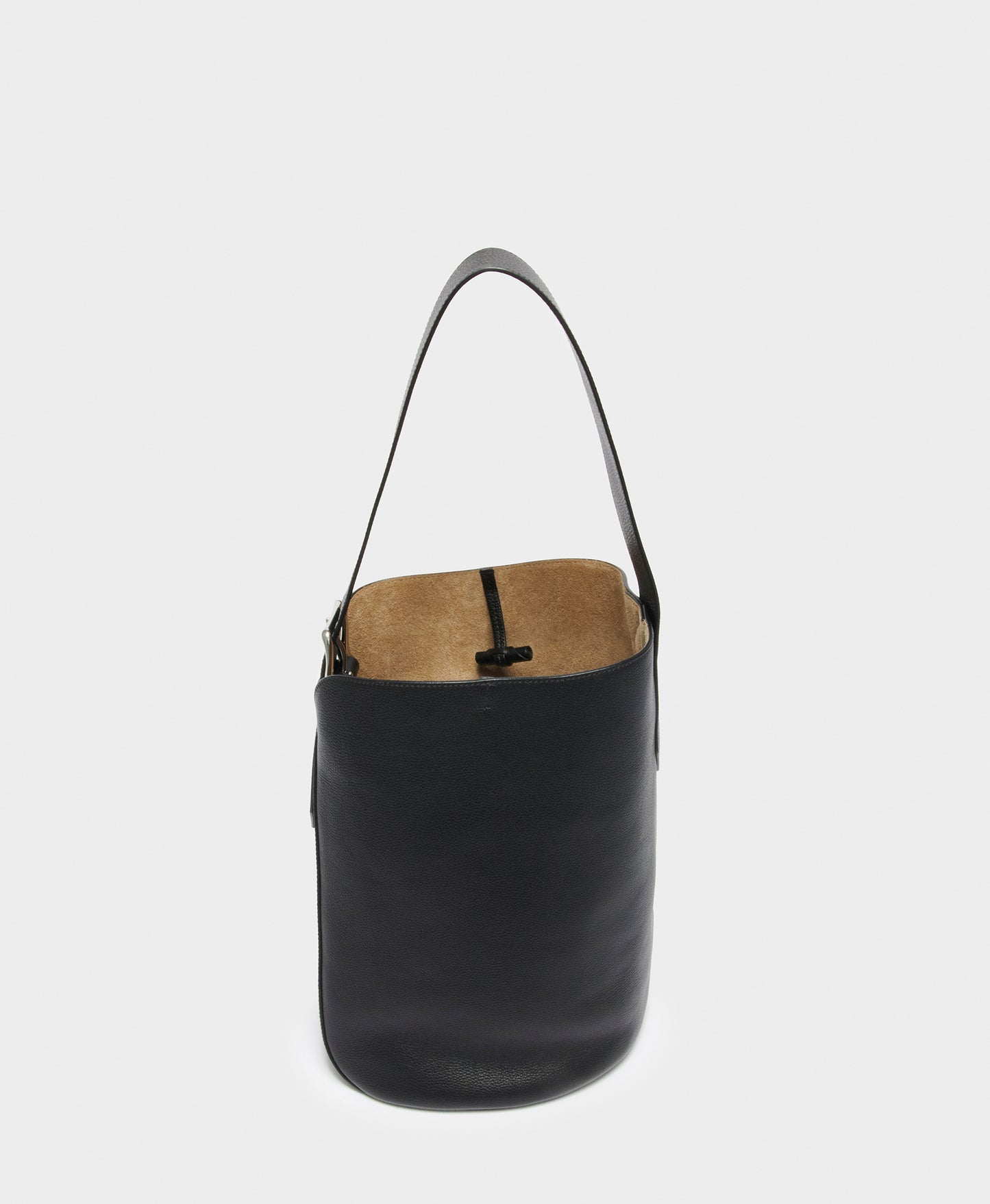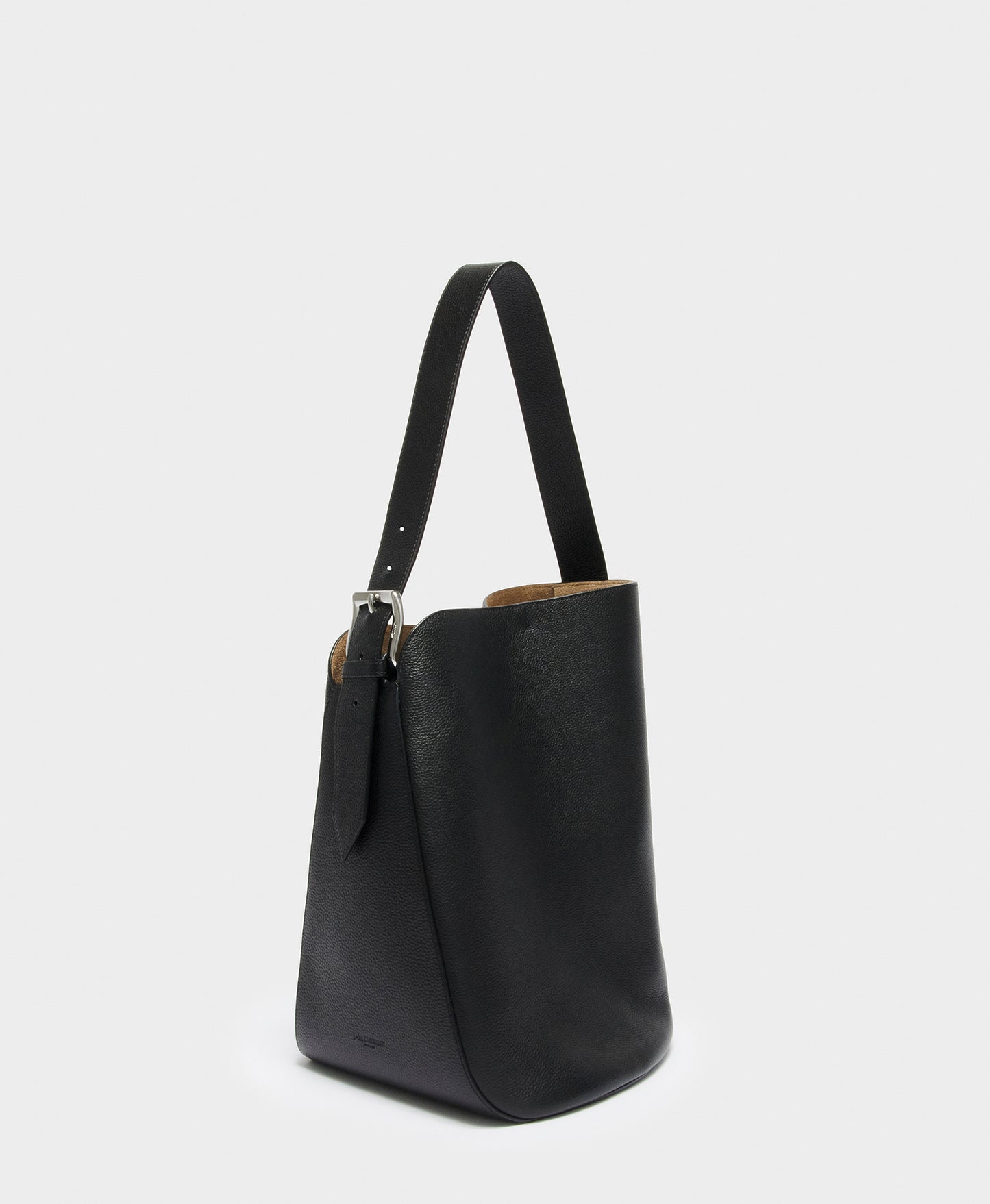 A uniquely shaped bag inspired by archers' quivers. With statement embossed silver hardware, the bag is made from black small grain leather and lined with suede. The bag is large enough to fit a laptop, and the adjustable handle allows the bag to be carried over the shoulder or in hand.