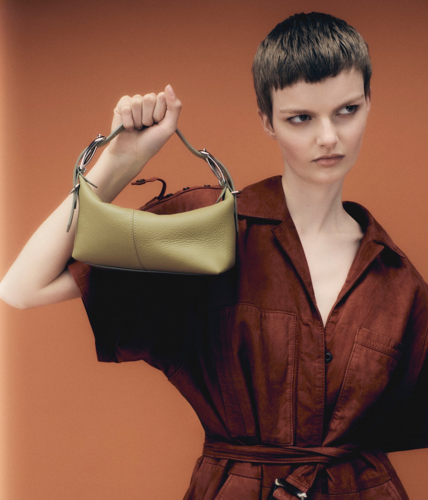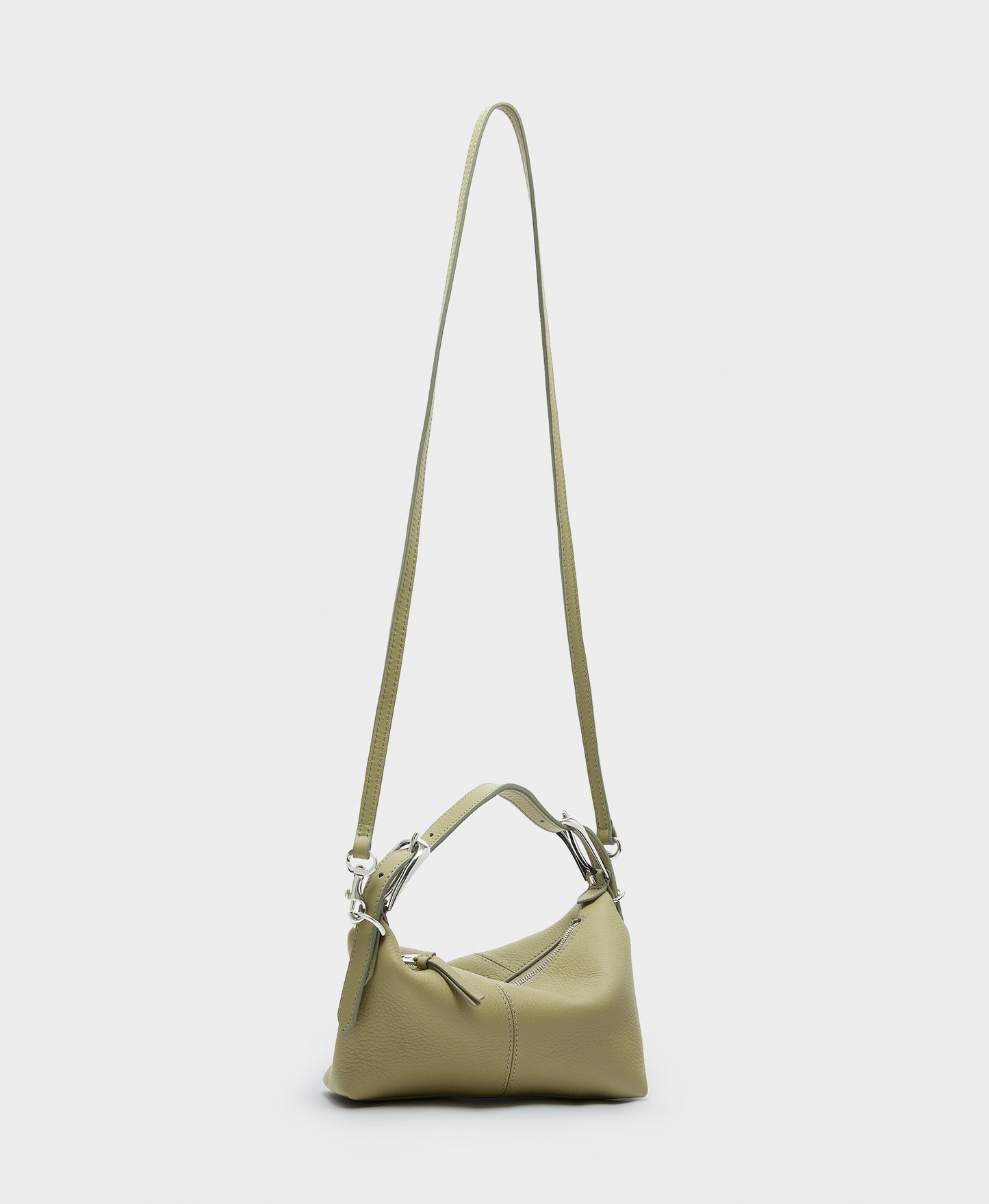 The Twist is a compact mini bag with a unique, twisted, asymmetrical design, featuring new silver, curved, pear-shaped buckles that give this functional accessory a stylish 'twist'. Crafted from moss-coloured natural grain leather, this bag is designed to be carried in hand and also includes a crossbody strap for added convenience.