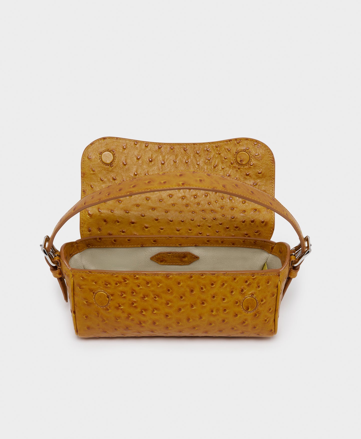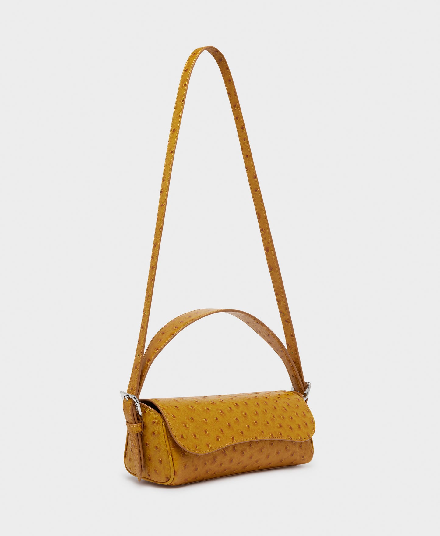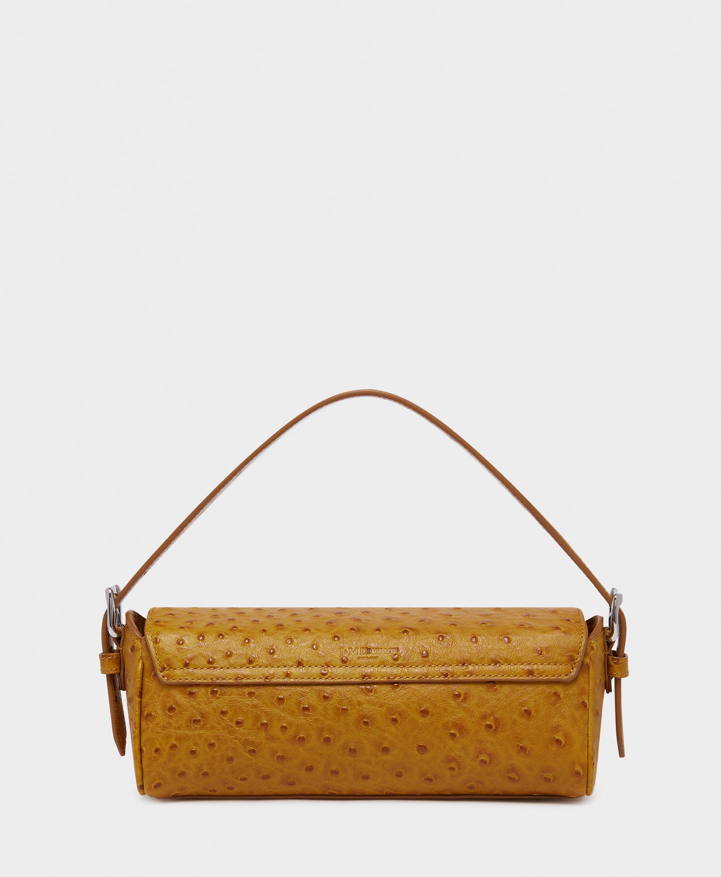 A new addition to the Bonny family, the Bonny Baguette in cognac is a compact bag with a utilitarian shape and smart hand strap, allowing it to be carried in a multitude of ways. The bag is made from Italian embossed ostrich leather and has a discreet magnet closure.