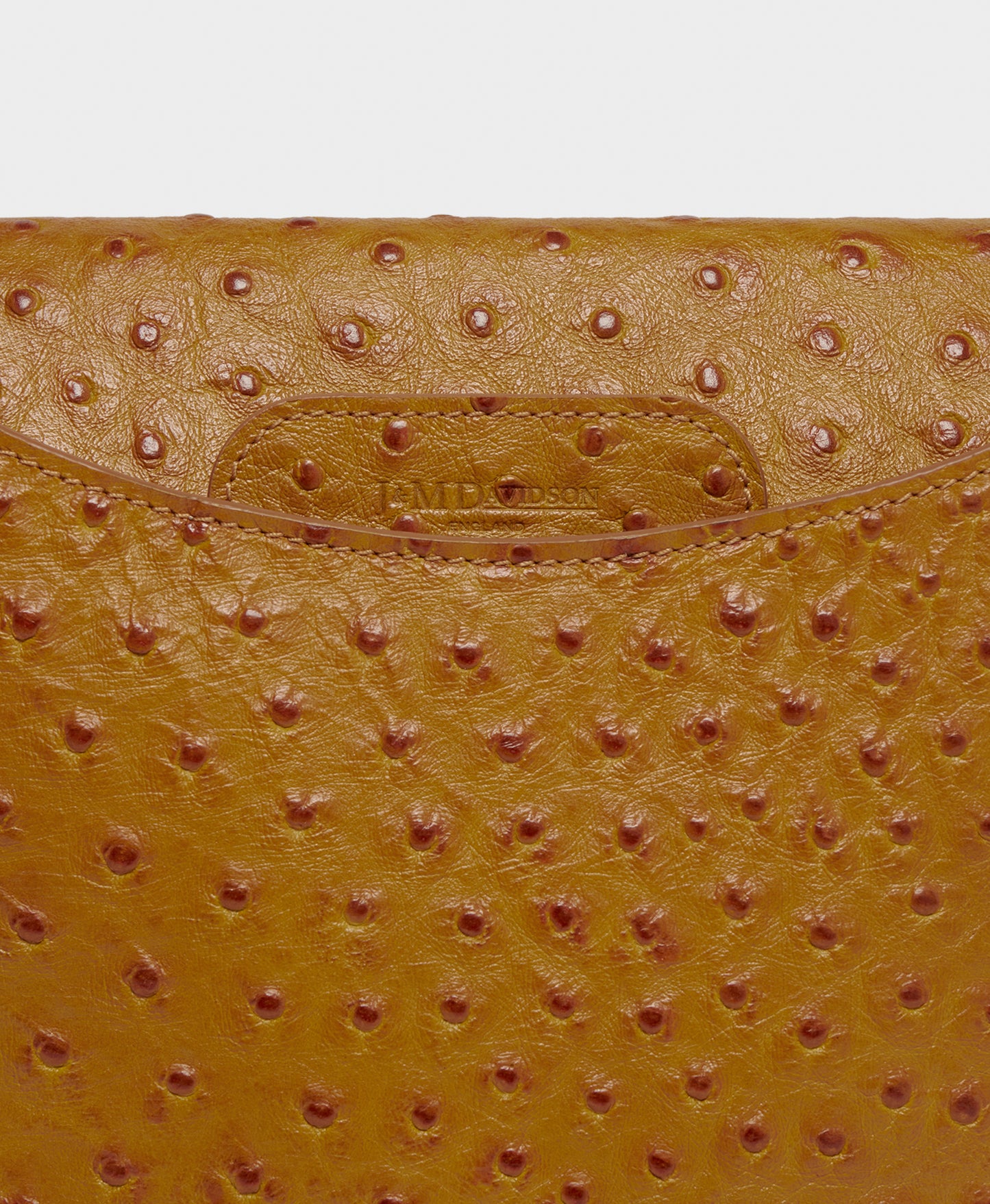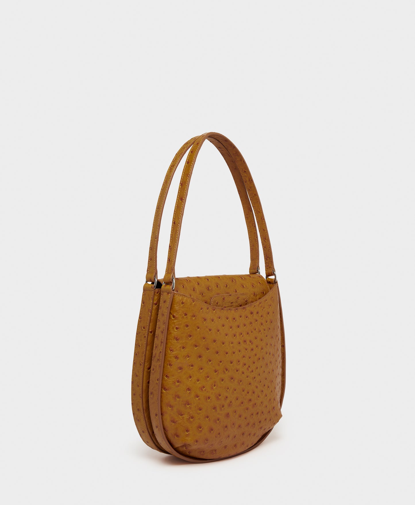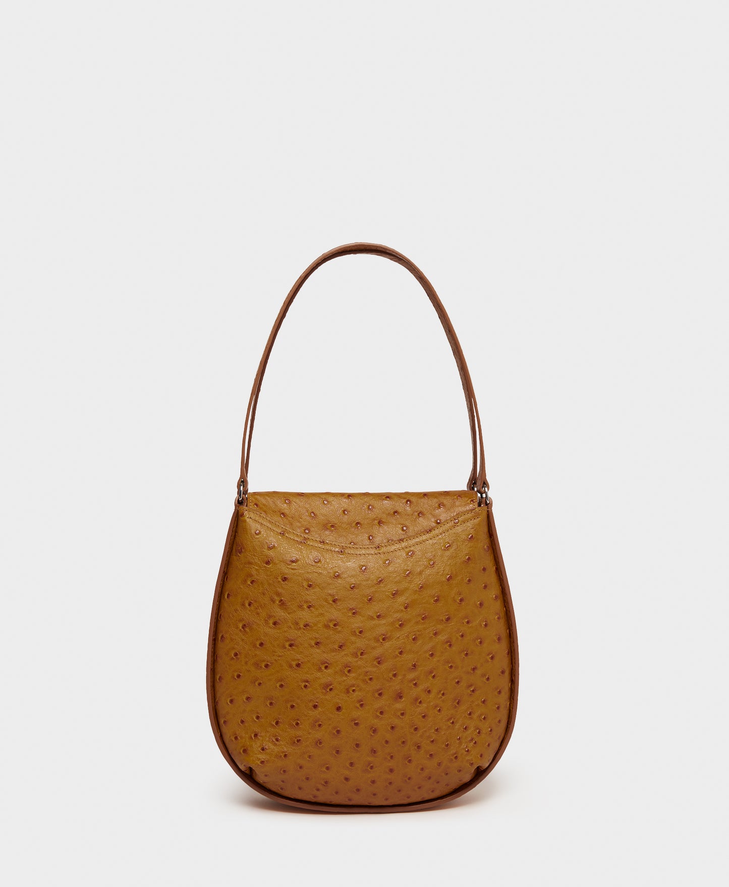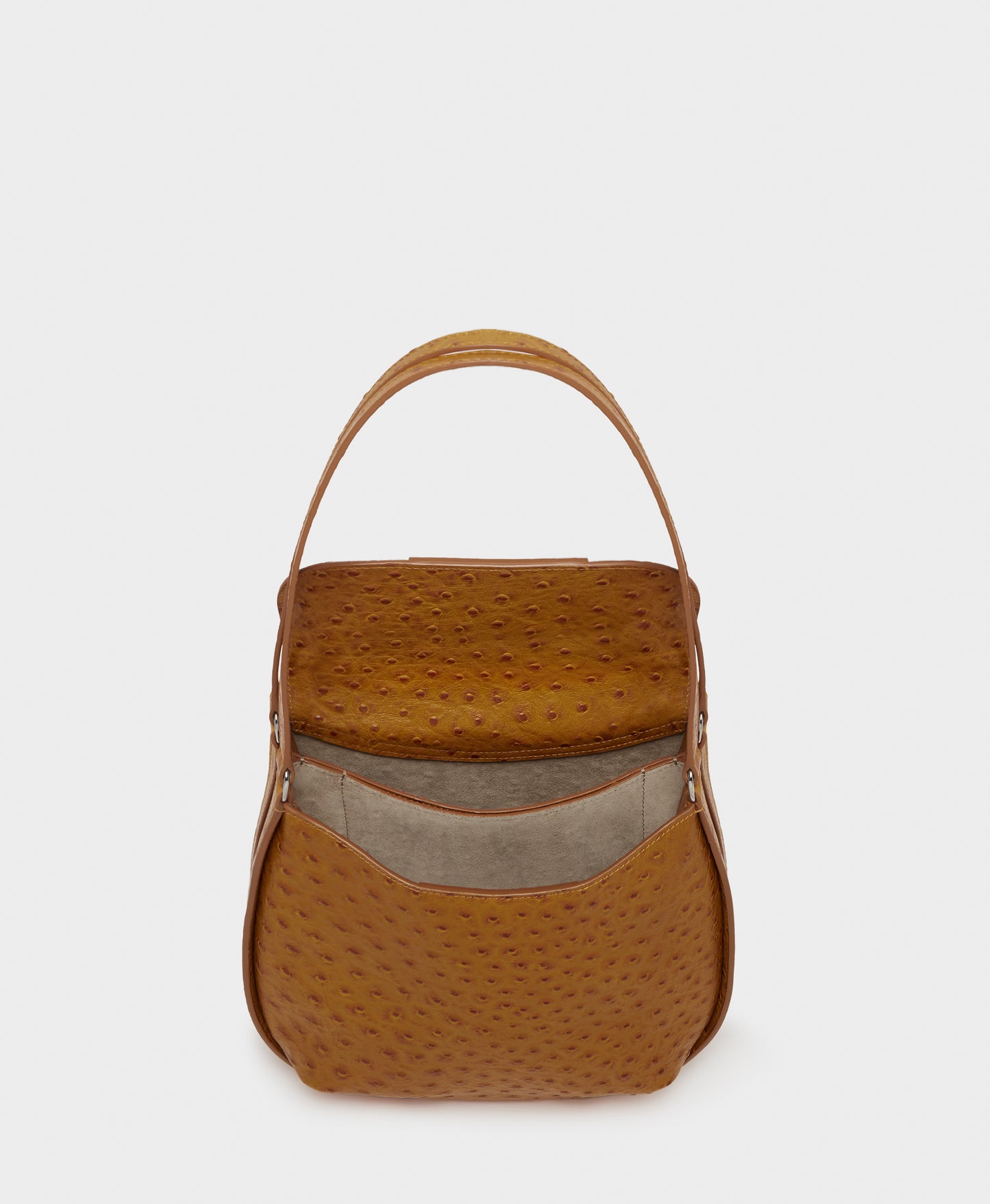 Practical and timelessly stylish, Dash in cognac is a chic addition to our collection. Shaped to mimic a 'dash of water', it is crafted in Italian embossed ostrich and is finished with a suede lining. The bag features a unique double handle, a double compartment, and an inner pocket to store smaller items.