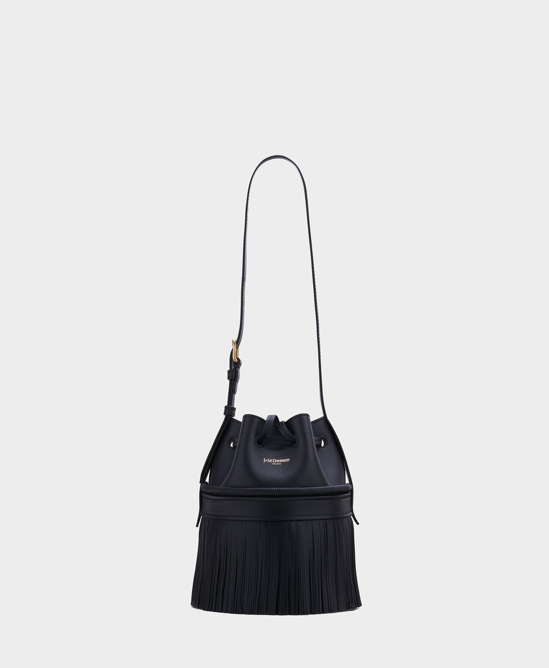 The perfect occasion bag, the Anniversary Carnival is a member of the Carnival family and is made from black smooth calf and lamb nappa leather. Featuring fringing and a drawstring fastening, it differs from its predecessor with a new long leather strap, which is accessorised with the statement J&MD brass buckle.