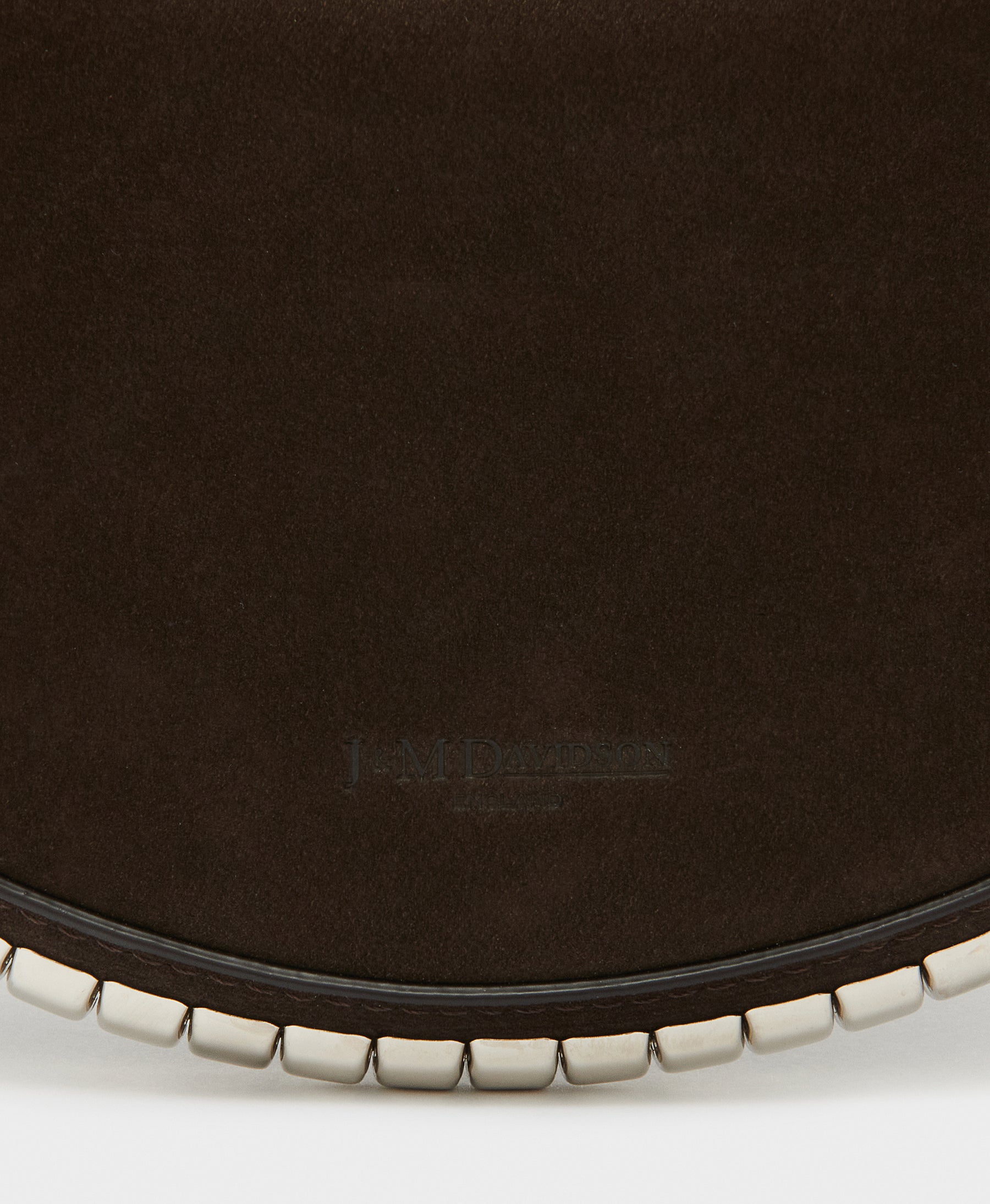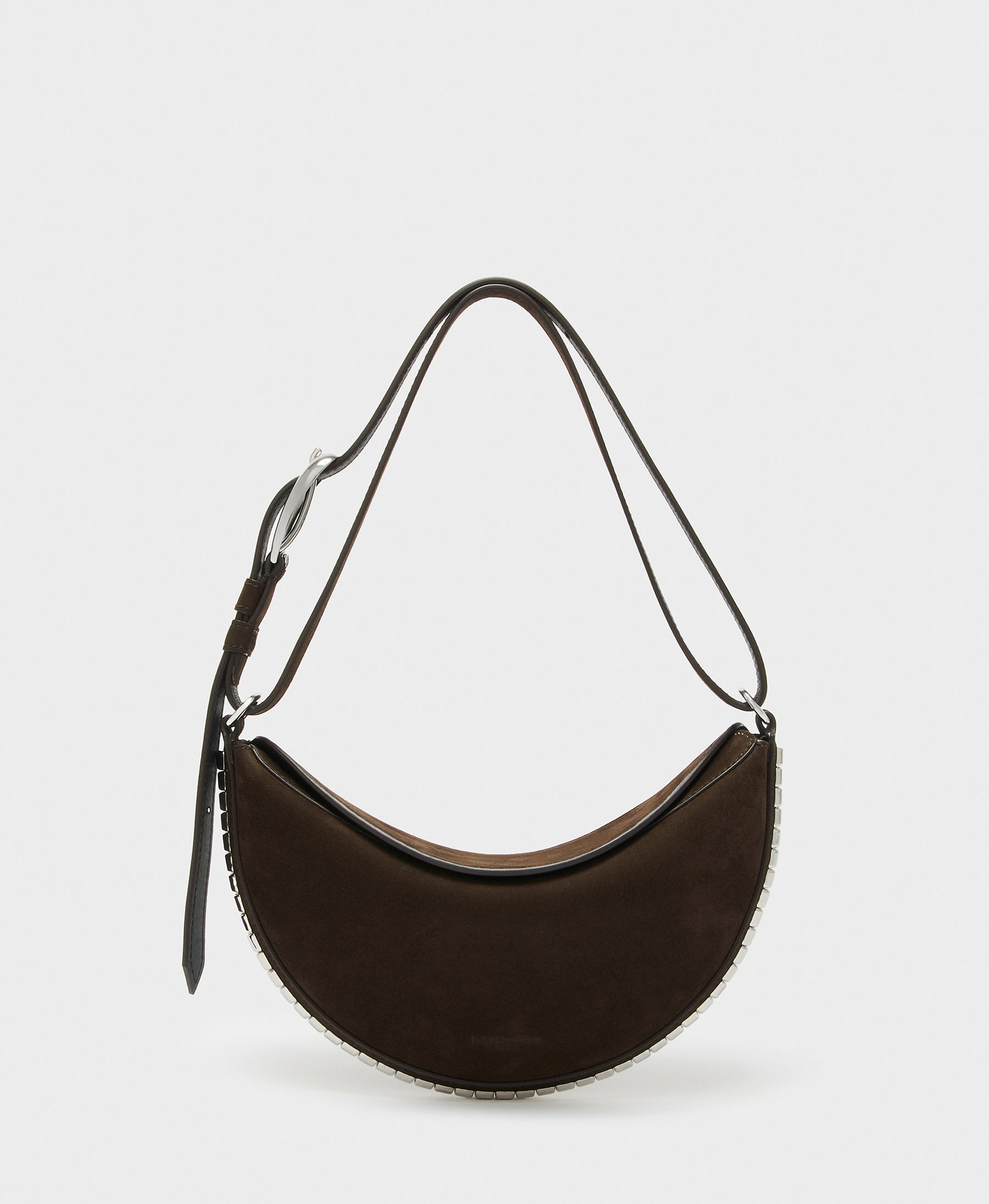 The signature Gondola is elevated with modern silver browband studs along the bottom rim, complemented by a new double handle and curved, pear-shaped silver hardware. Crafted from soft and silky marron-coloured nubuck leather with smooth calf trims, the Gondola’s double handle allows it to be worn on the shoulder or as a crossbody.