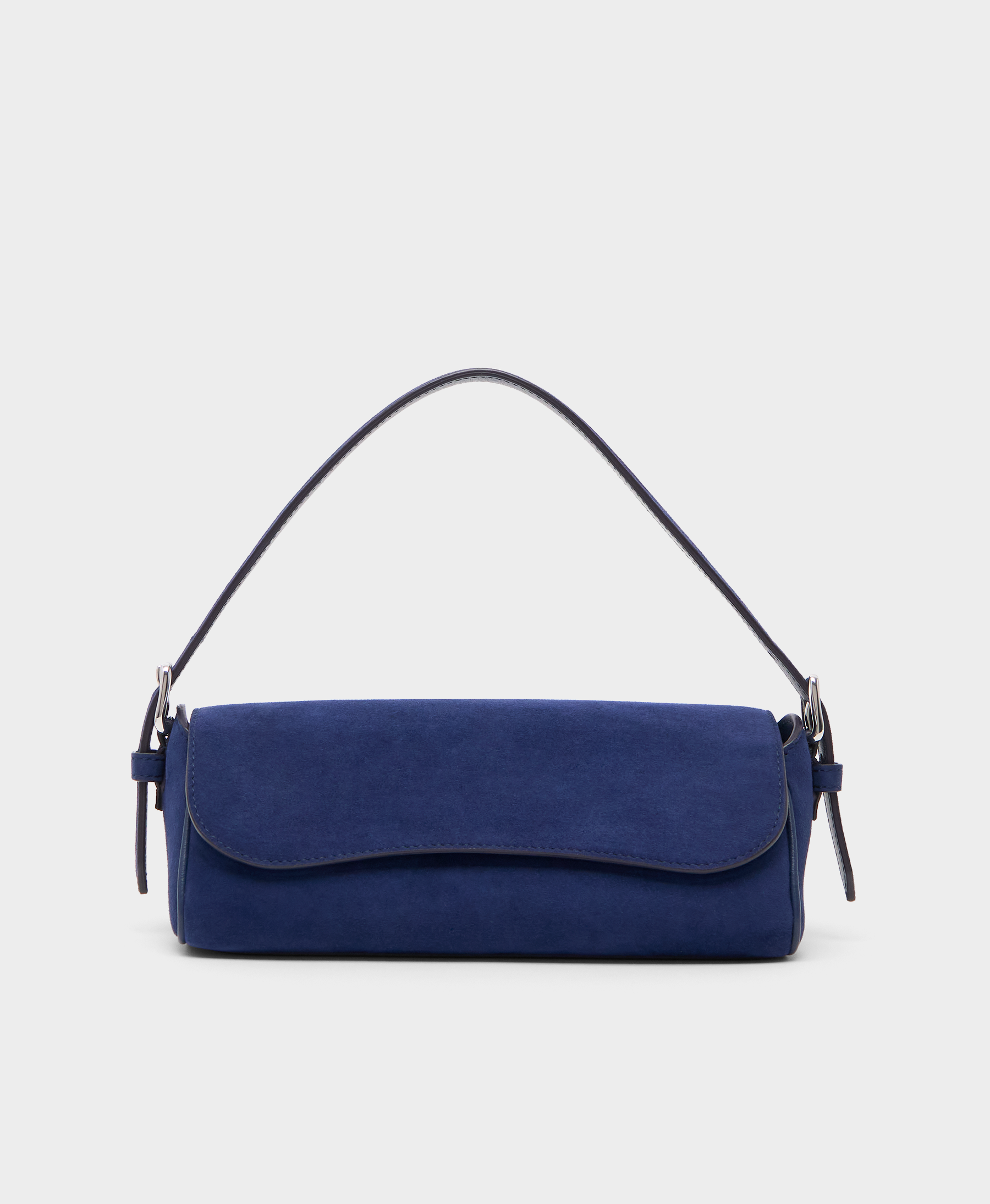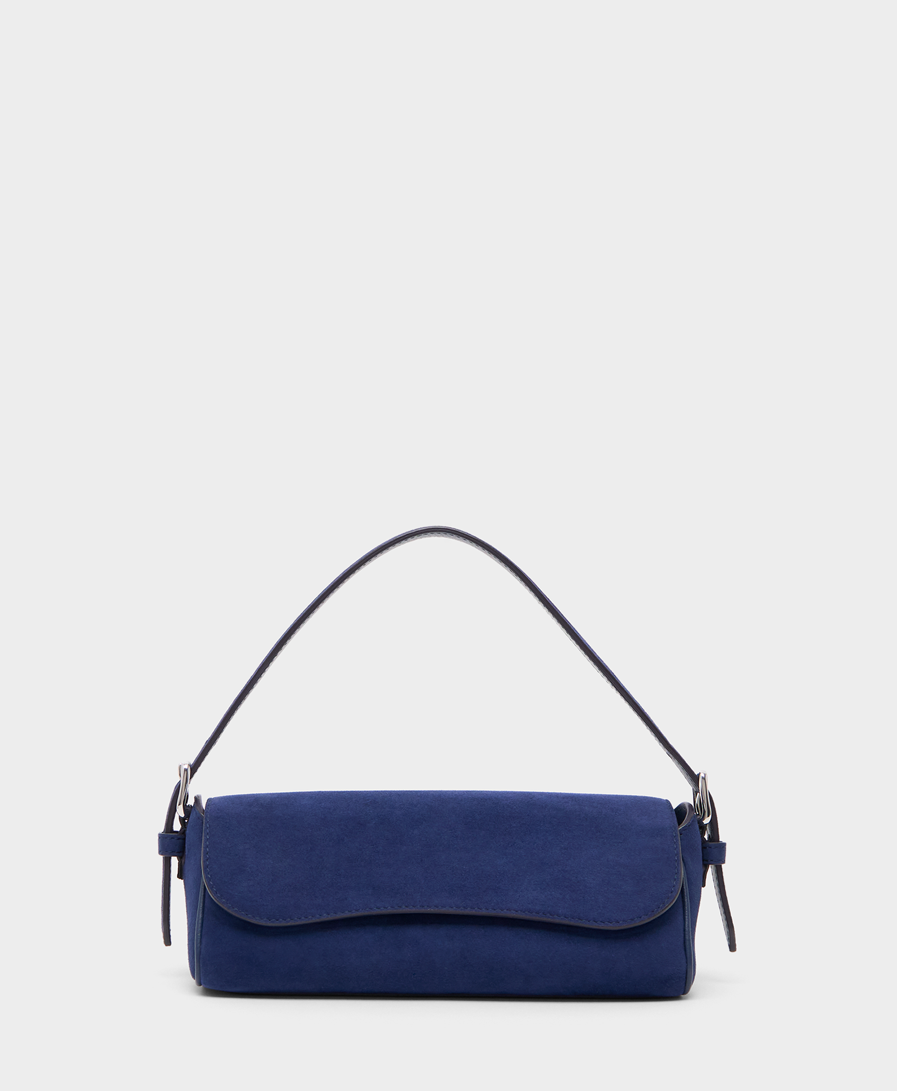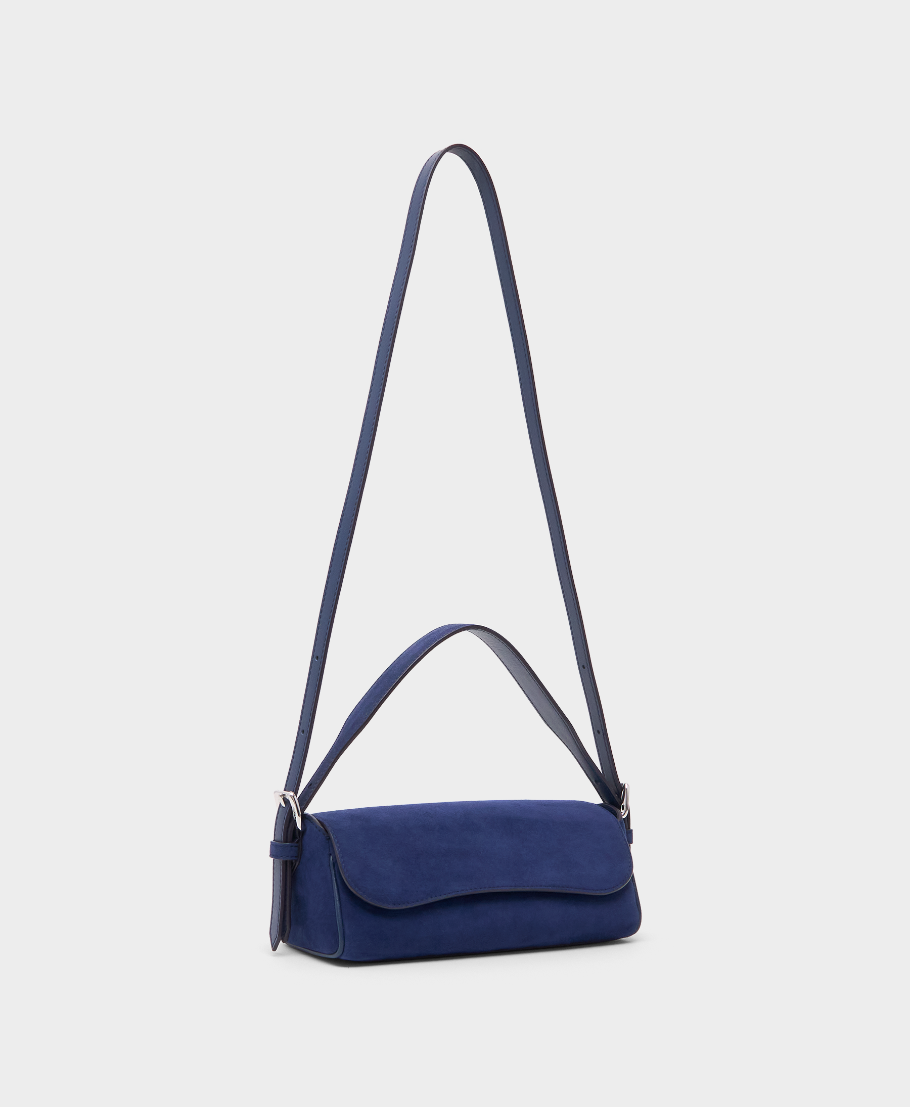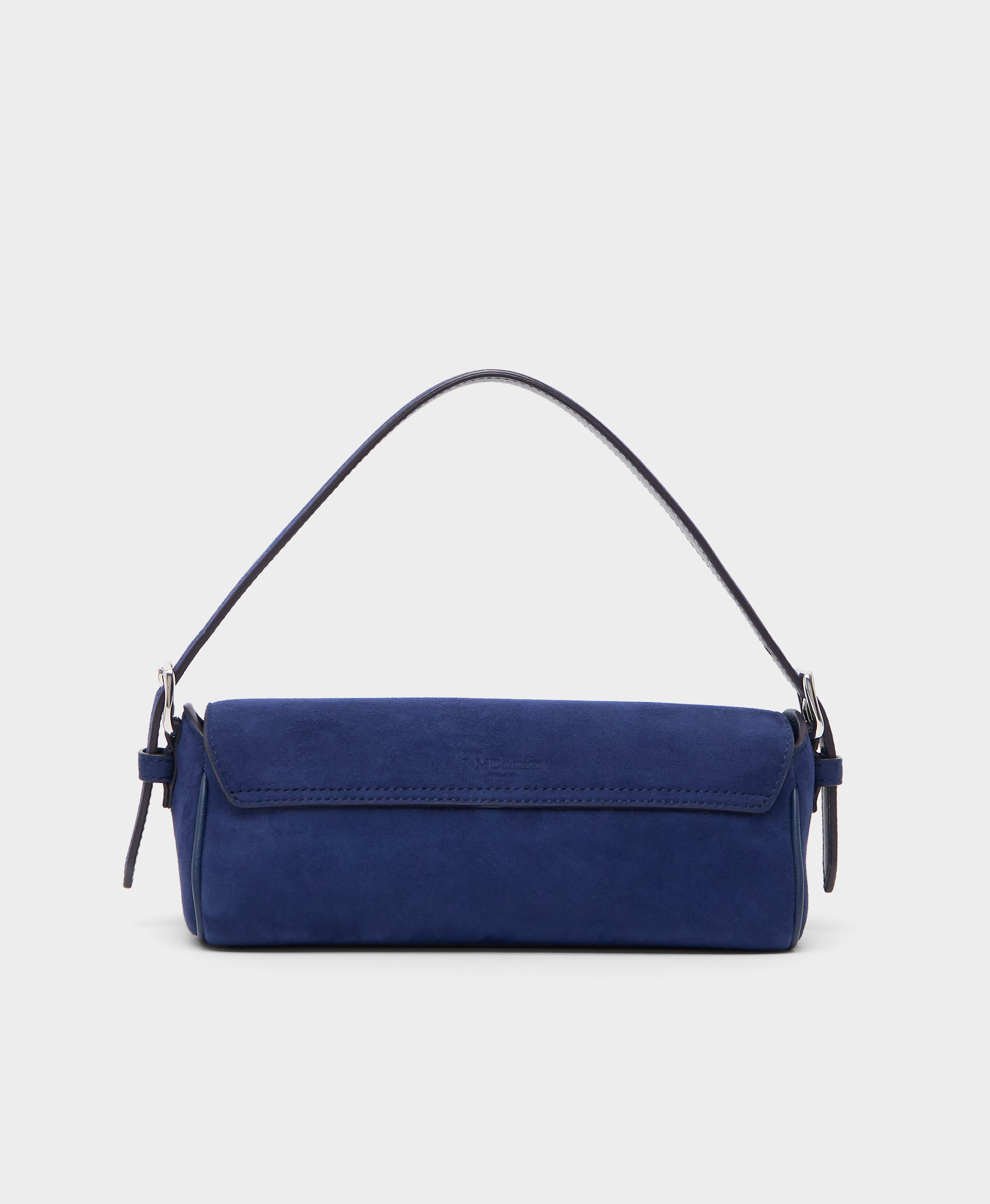A member of the Bonny family, the Bonny Baguette is a compact bag with a utilitarian shape and smart hand strap, allowing it to be carried in a multitude of ways. The bag is handmade in Spain from marine coloured soft suede and smooth calf leather, and it has a discreet magnet closure.