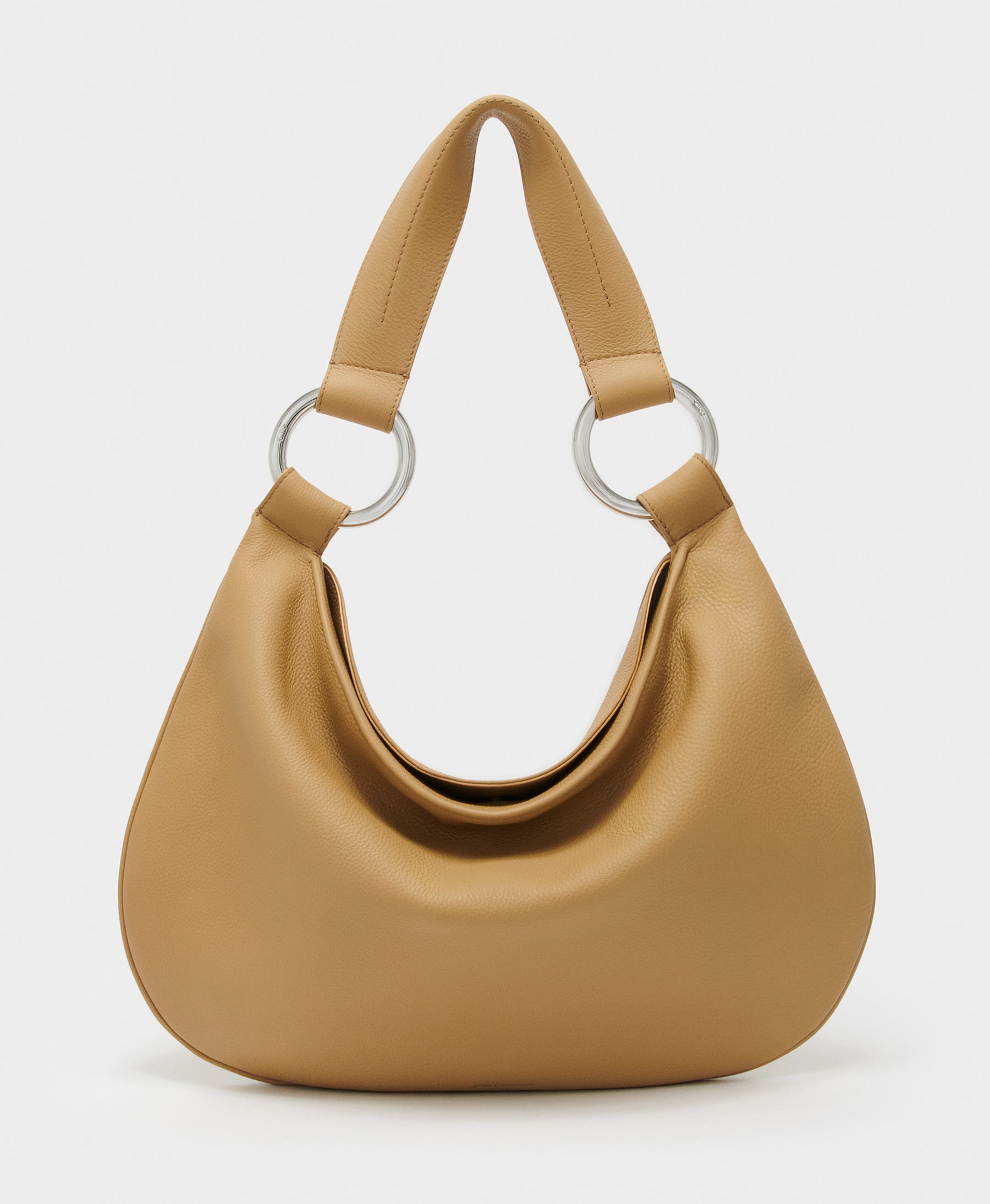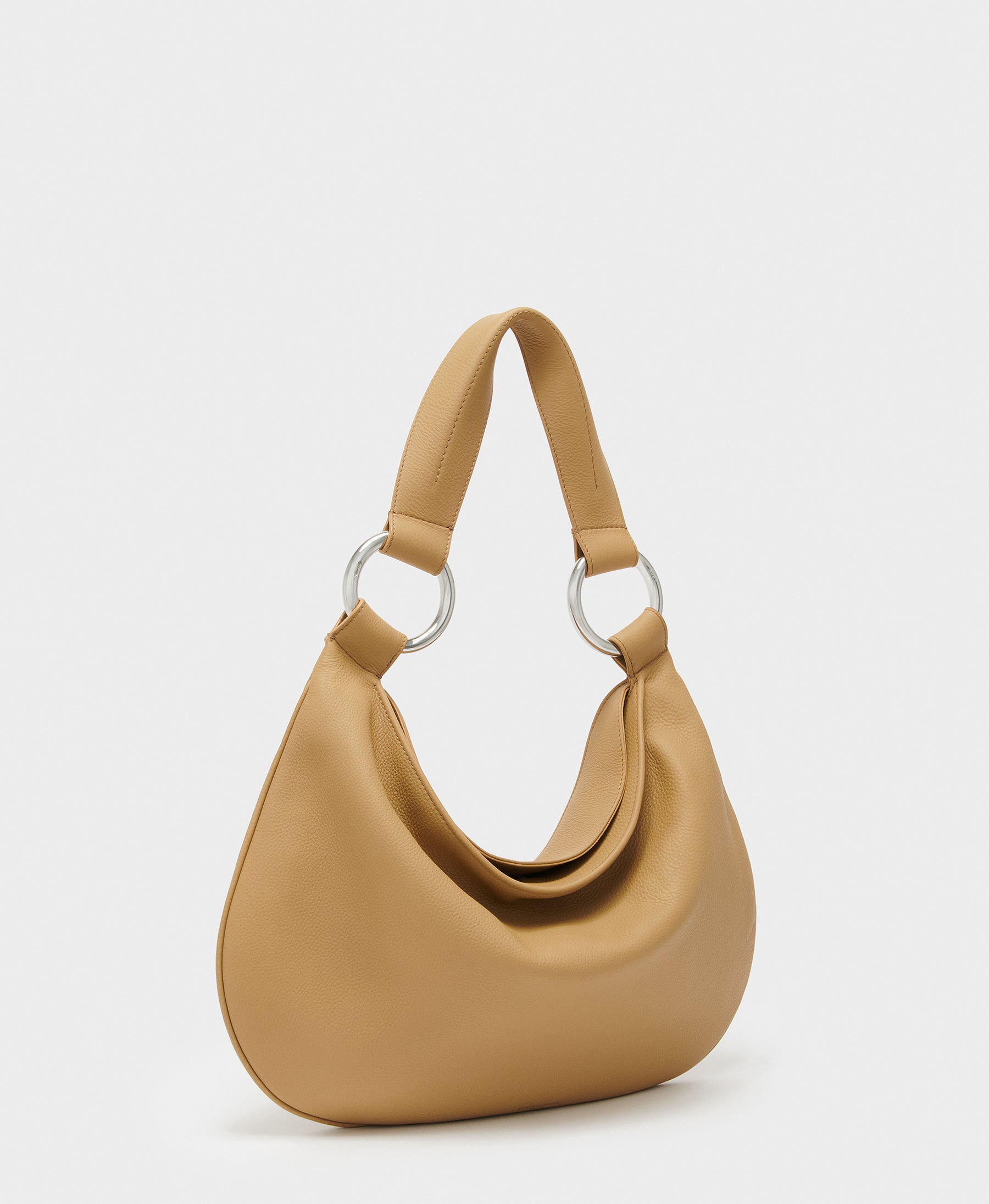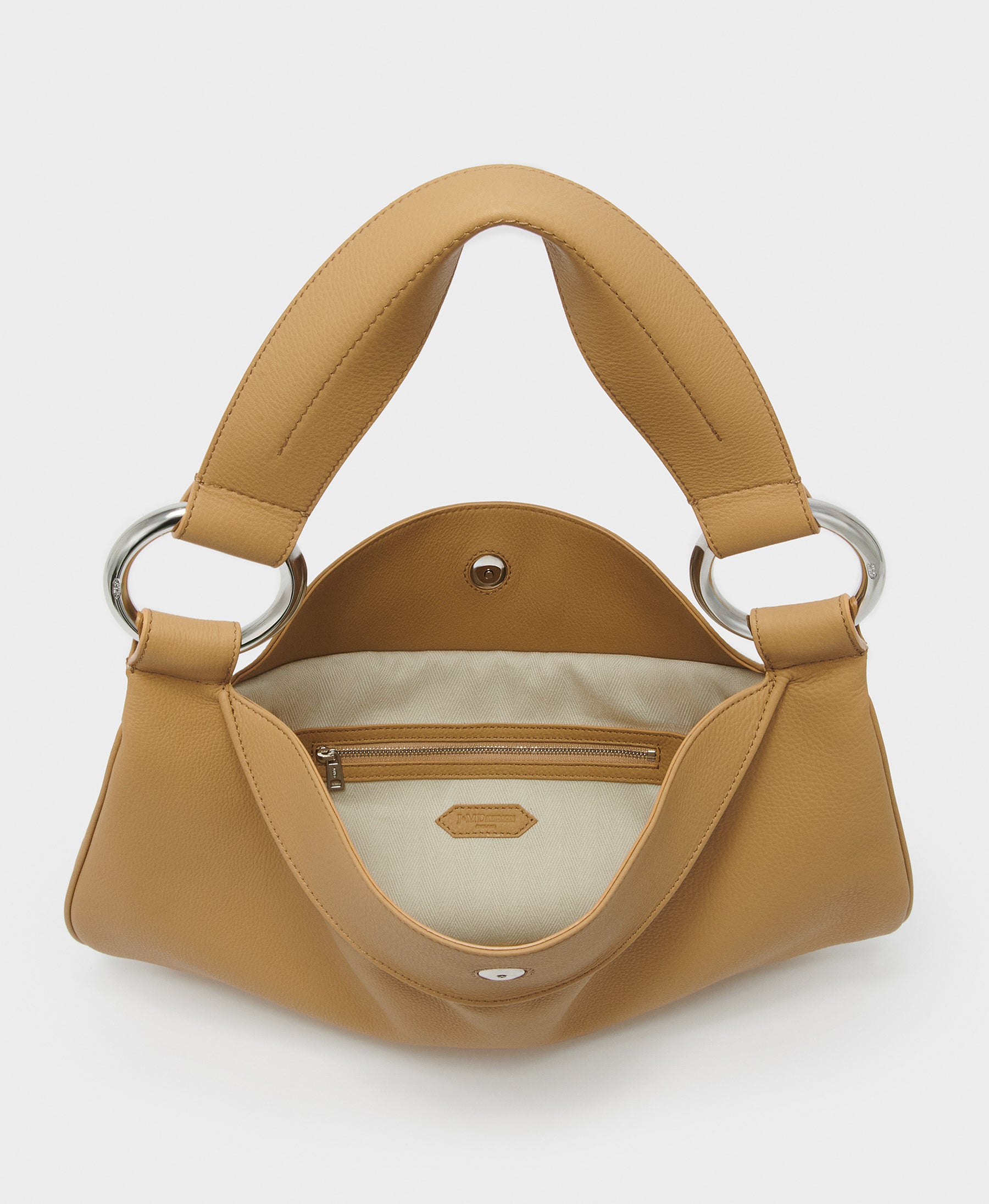 The Hoop in dijon draws its inspiration from vintage ring hardware found in J&M Davidson's archive collection. Its design mimics the circular form of these rings, seamlessly blending curves with supple natural grain leather. It is a wonderfully relaxed hobo-style bag that effortlessly accommodates your daily essentials. With a uniquely curved handle that rests snugly on your shoulders, it also conveniently folds in half for comfortable hand-carrying when needed.