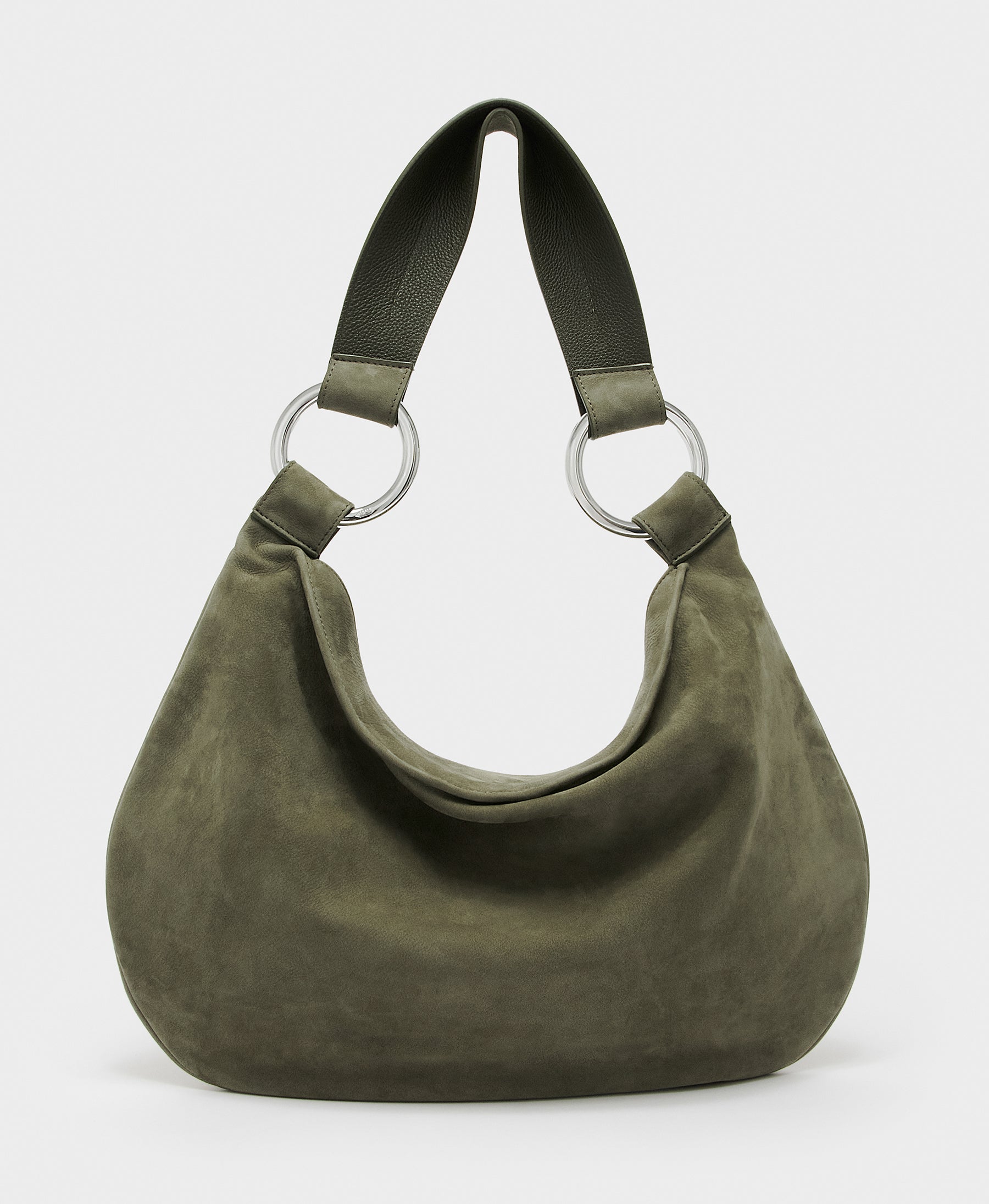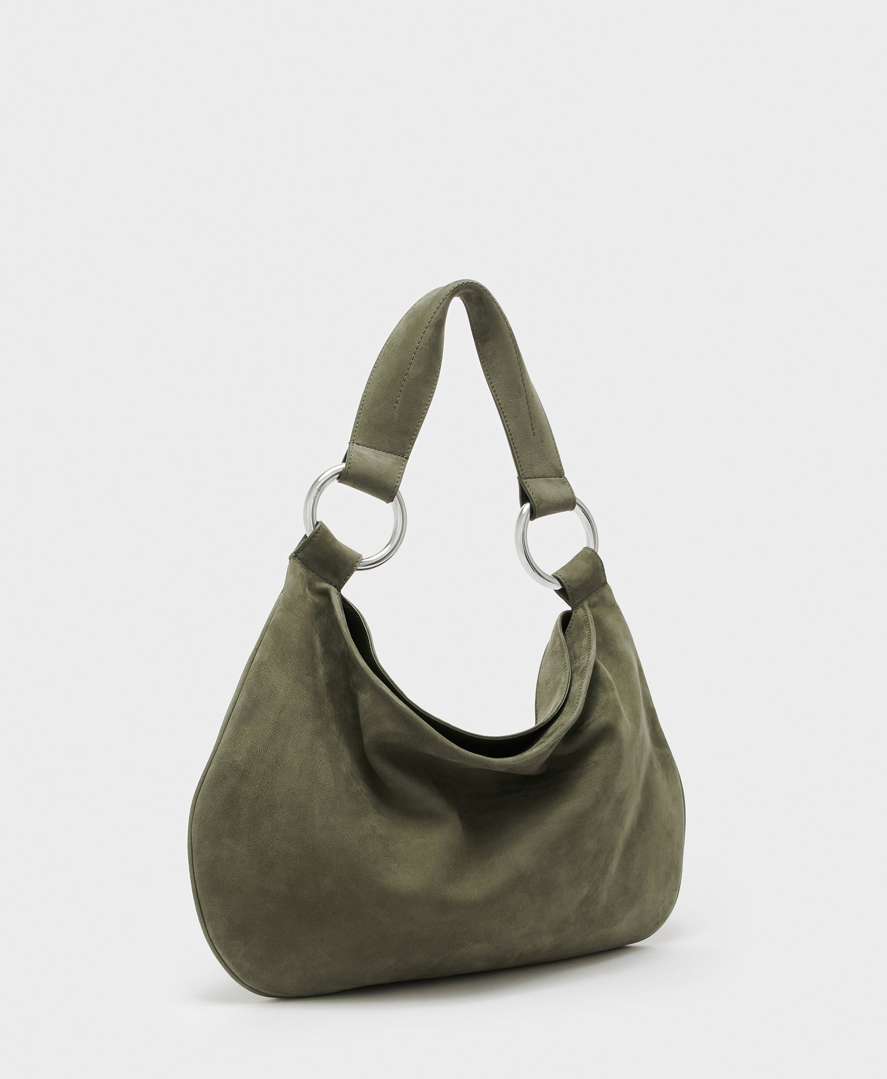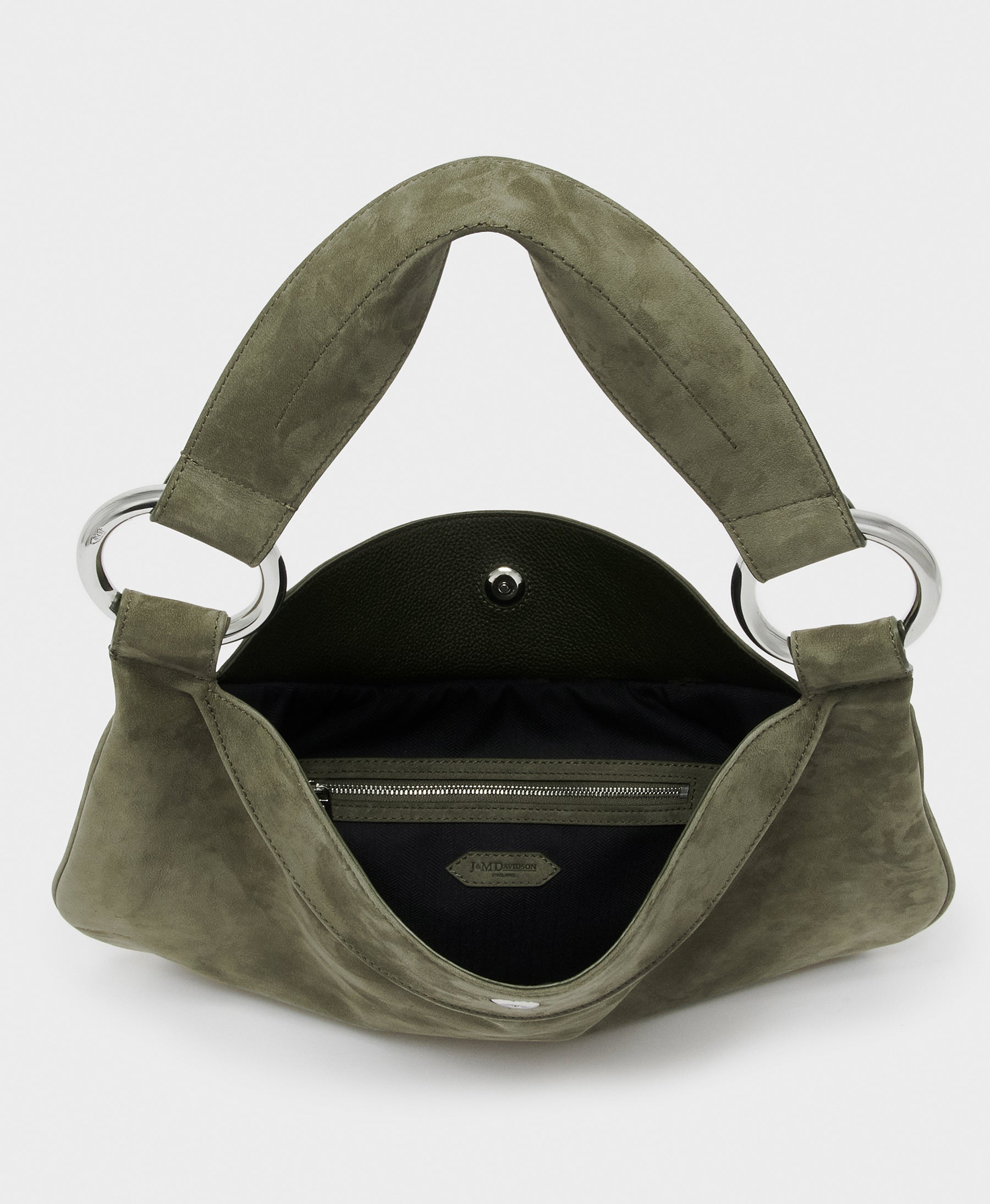 The Hoop in pickle draws its inspiration from vintage ring hardware found in J&M Davidson's archive collection. Its design mimics the circular form of these rings, seamlessly blending curves with soft and supple nubuck leather. It is a wonderfully relaxed hobo-style bag that effortlessly accommodates your daily essentials. With a uniquely curved handle that rests snugly on your shoulders, it also conveniently folds in half for comfortable hand-carrying when needed.