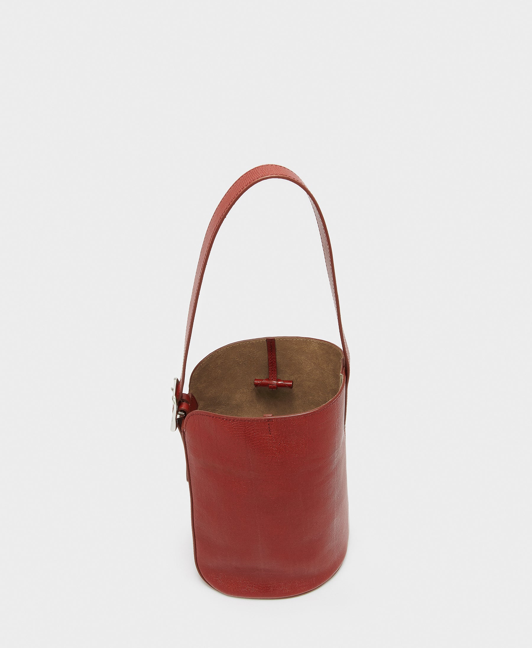 A smaller version of the Quiver Bucket, this uniquely shaped bag is inspired by archers' quivers. With statement embossed J&MD silver hardware, the bag is made from jam-coloured embossed lizard calf leather and is lined with suede. The Mini Quiver Bucket has an adjustable handle, which allows it to be carried over the shoulder or in hand.