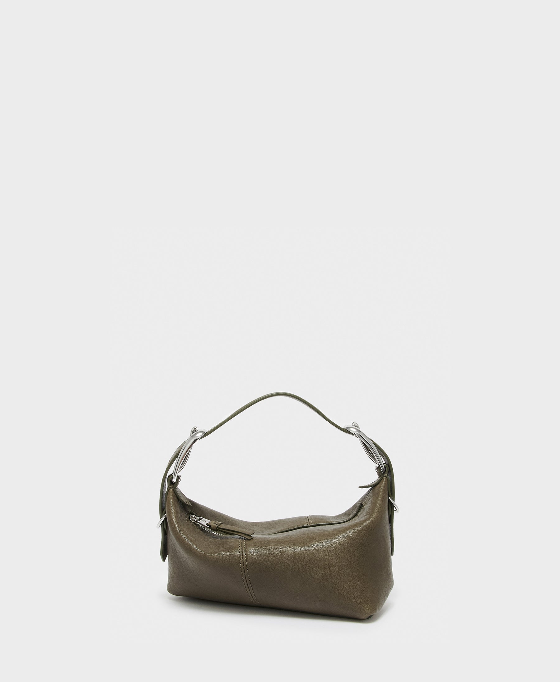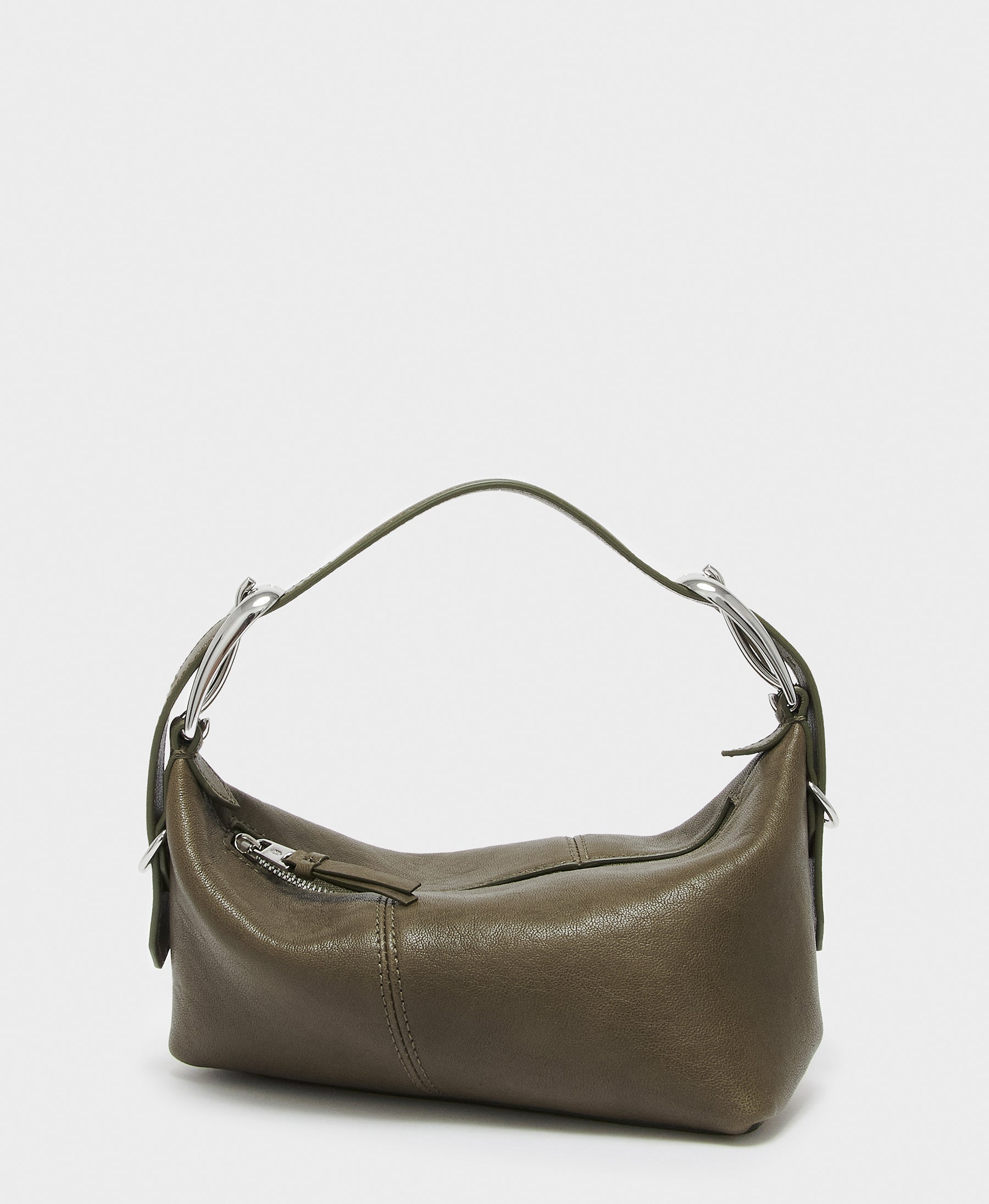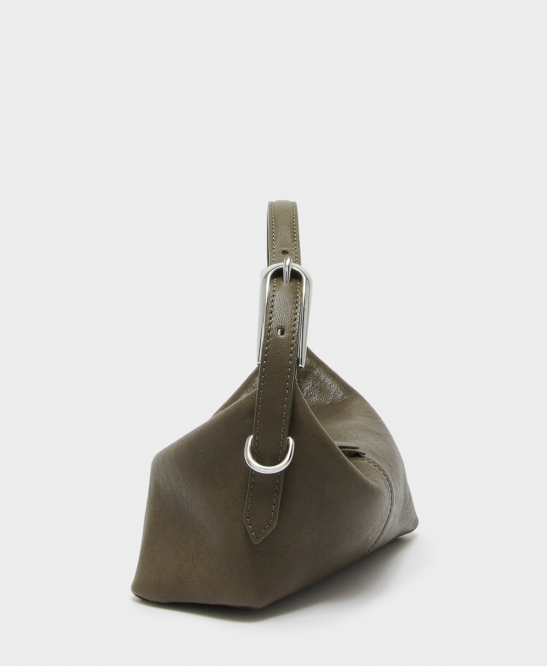 The Twist is a compact mini bag, distinguished by its asymmetrical silhouette and curved, pear-shaped silver buckles - adding a stylish ‘twist’ to a functional accessory. Crafted from soft, buttery pickle-coloured textured nappa leather, it’s designed to be carried by hand and also includes a detachable crossbody strap for added versatility.