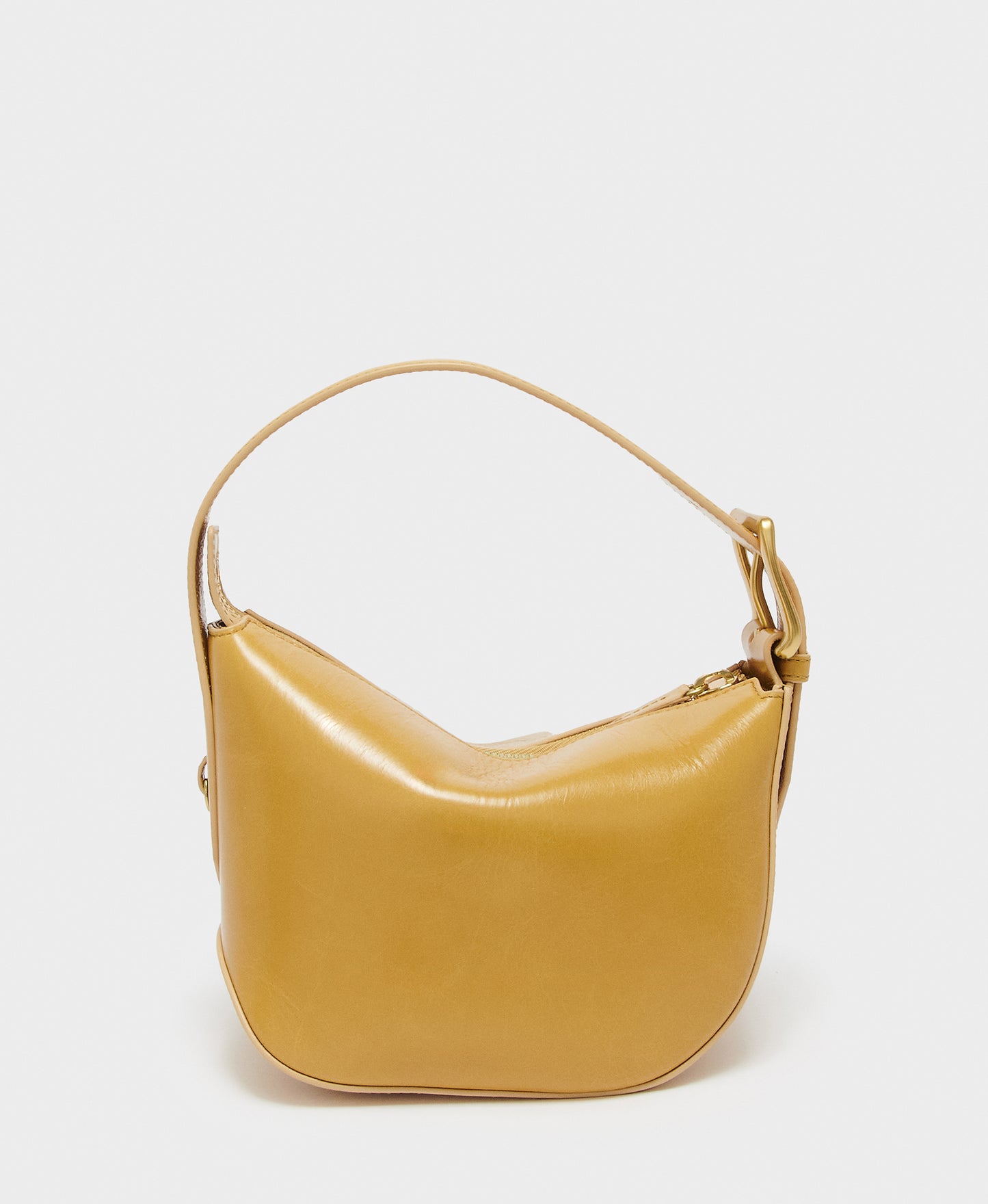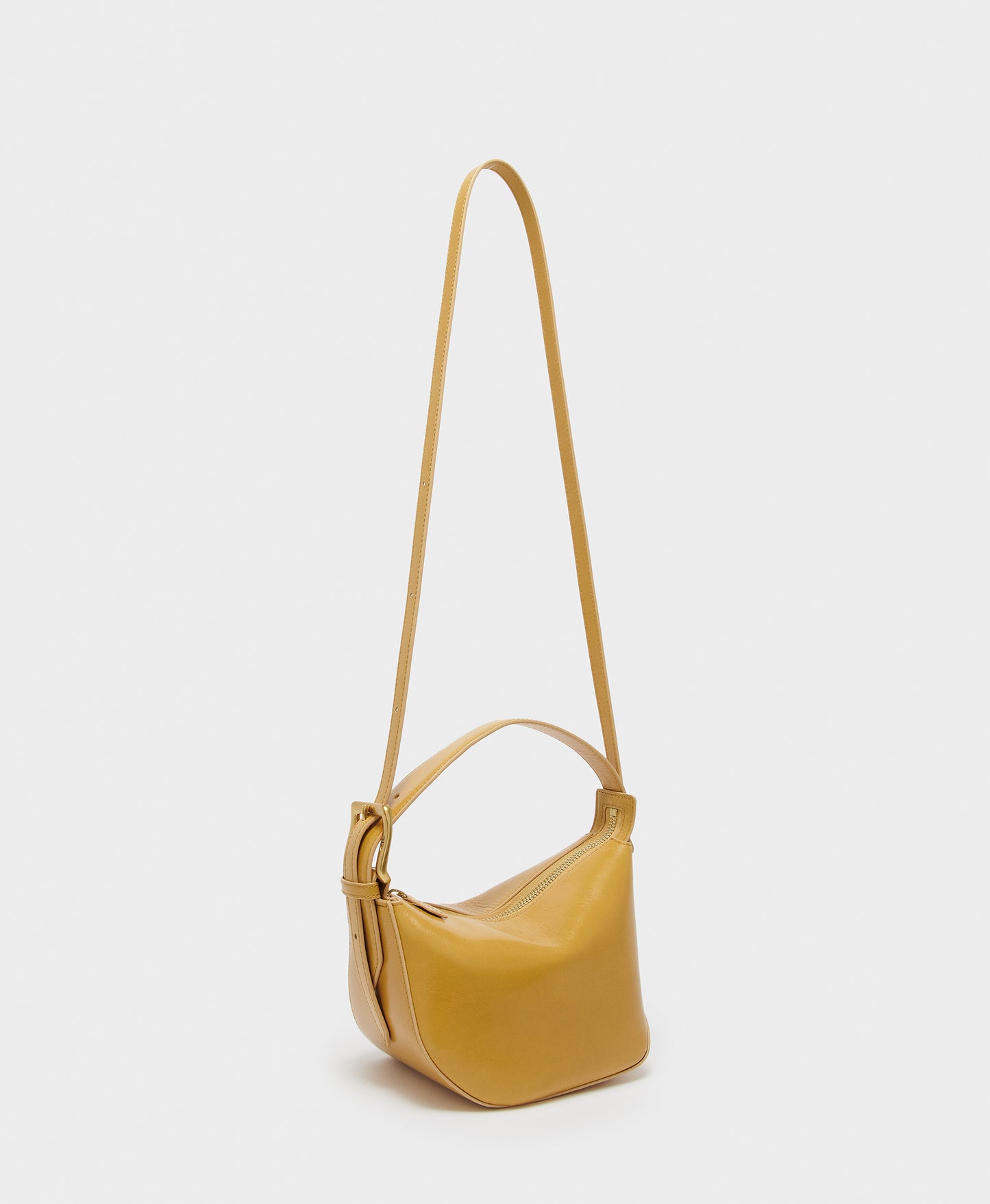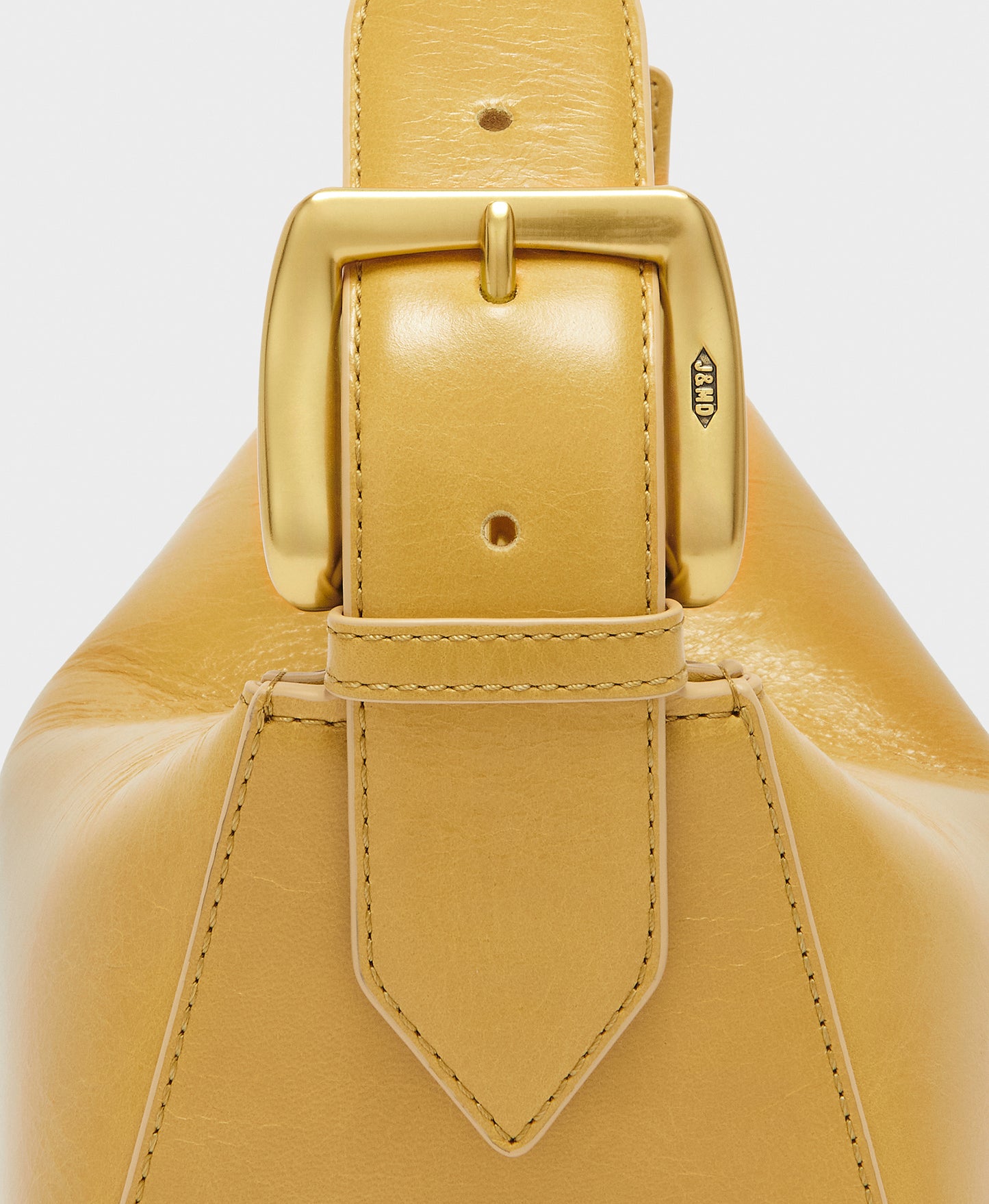 A member of the Quiver family, this dynamic-shaped bag is made from our new mustard-coloured cracked leather. This calf leather boasts a distinctive cracked, cloudy finish, imbuing the bag with a vintage and timeless aesthetic. It has a simple zip closure and robust handle and features J&MD's statement brass buckle. While it is designed to be carried in hand, it also has a long detachable strap, allowing it to be worn crossbody.